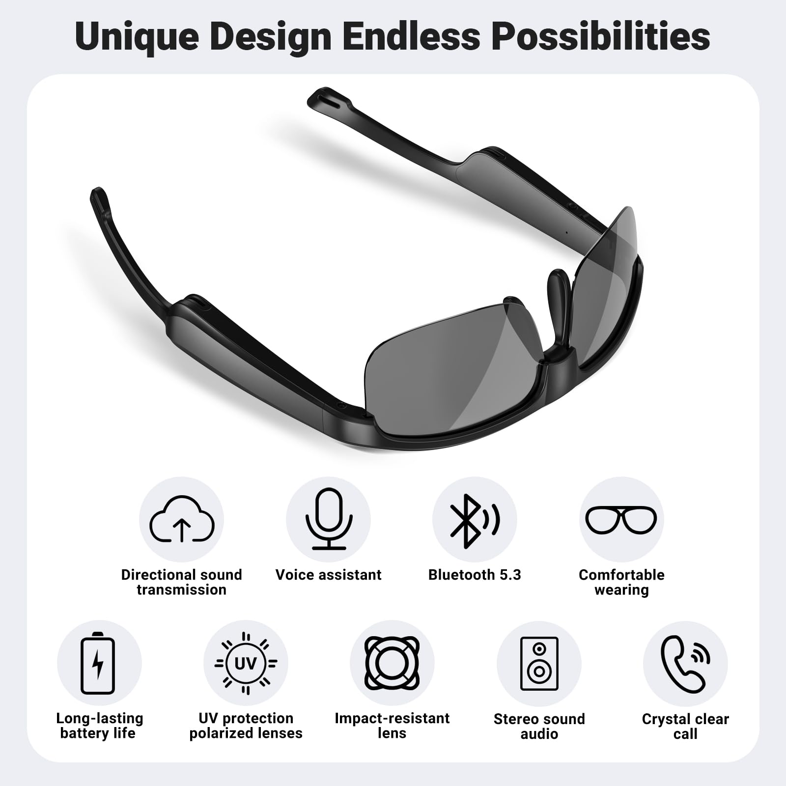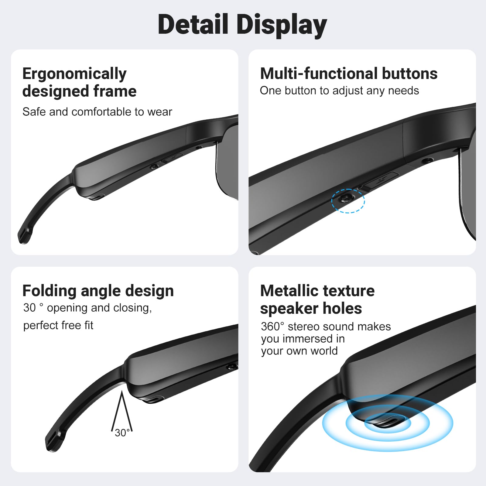 Powerful Multifunctional Button: Changing music tracks, playing or pausing media, managing calls and activating the voice assistant function is easy with just one button, making the design of your glasses fashion and easy to use.