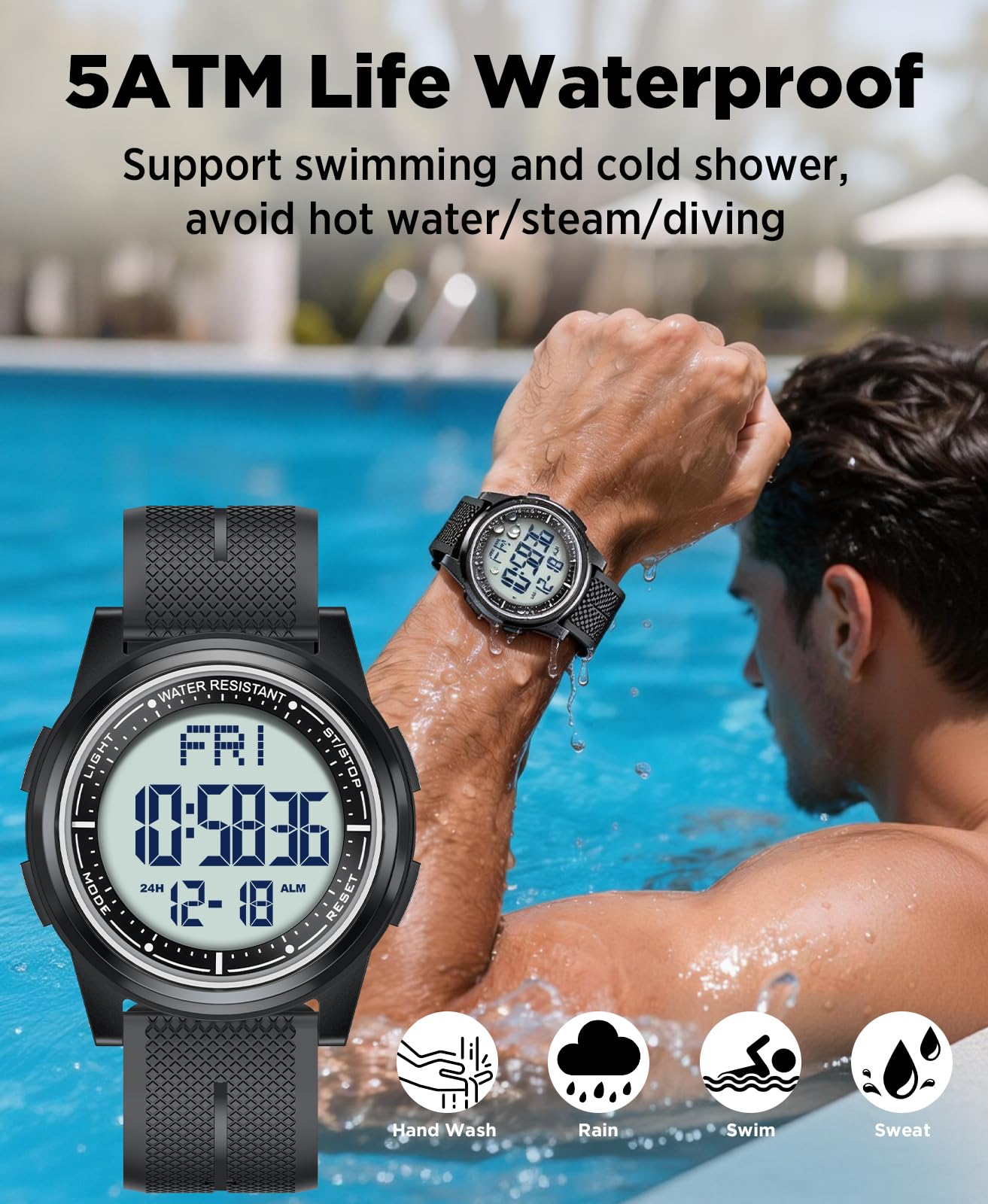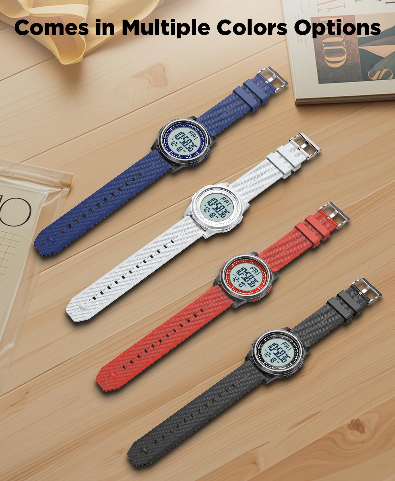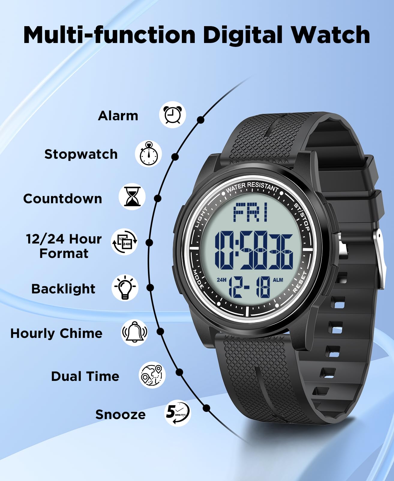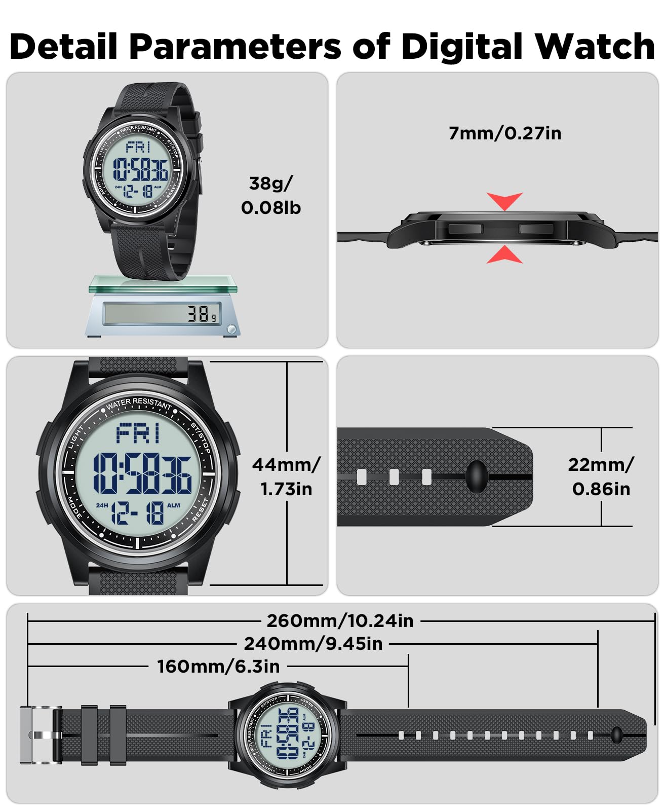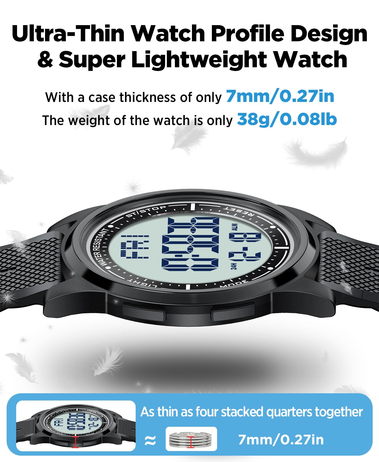 Description Ultra-Thin Digital Watch – Sleek, Waterproof & Multi-Functional Versatile & Stylish Design Designed for both men and women, this ultra-thin (6.6mm) digital watch combines modern minimalism with high functionality. Its sleek case and textured band offer a lightweight, comfortable fit for all-day wear. Crystal-Clear EL Backlight Display Features a wide-angle digital screen with bright EL backlight, ensuring effortless readability day or night. Perfect for low-light conditions, workouts, or travel. 50m Water Resistance – Swim & Shower Safe Built for active lifestyles, this watch is waterproof up to 164ft (50m), making it ideal for swimming, showering, and rainy weather. Smart Multi-Function Features 12/24-hour time format Date & day display Alarm, stopwatch, and countdown timer Dual time zone support (great for travelers) Durable & Comfortable for Everyday Wear The scratch-resistant screen and flexible textured band ensure long-lasting durability, while the ultra-lightweight build keeps it comfortable for work, sports, or travel. Perfect for Active Lifestyles Whether you're swimming, running, traveling, or working, this digital watch keeps you on time with reliable performance and sleek style.