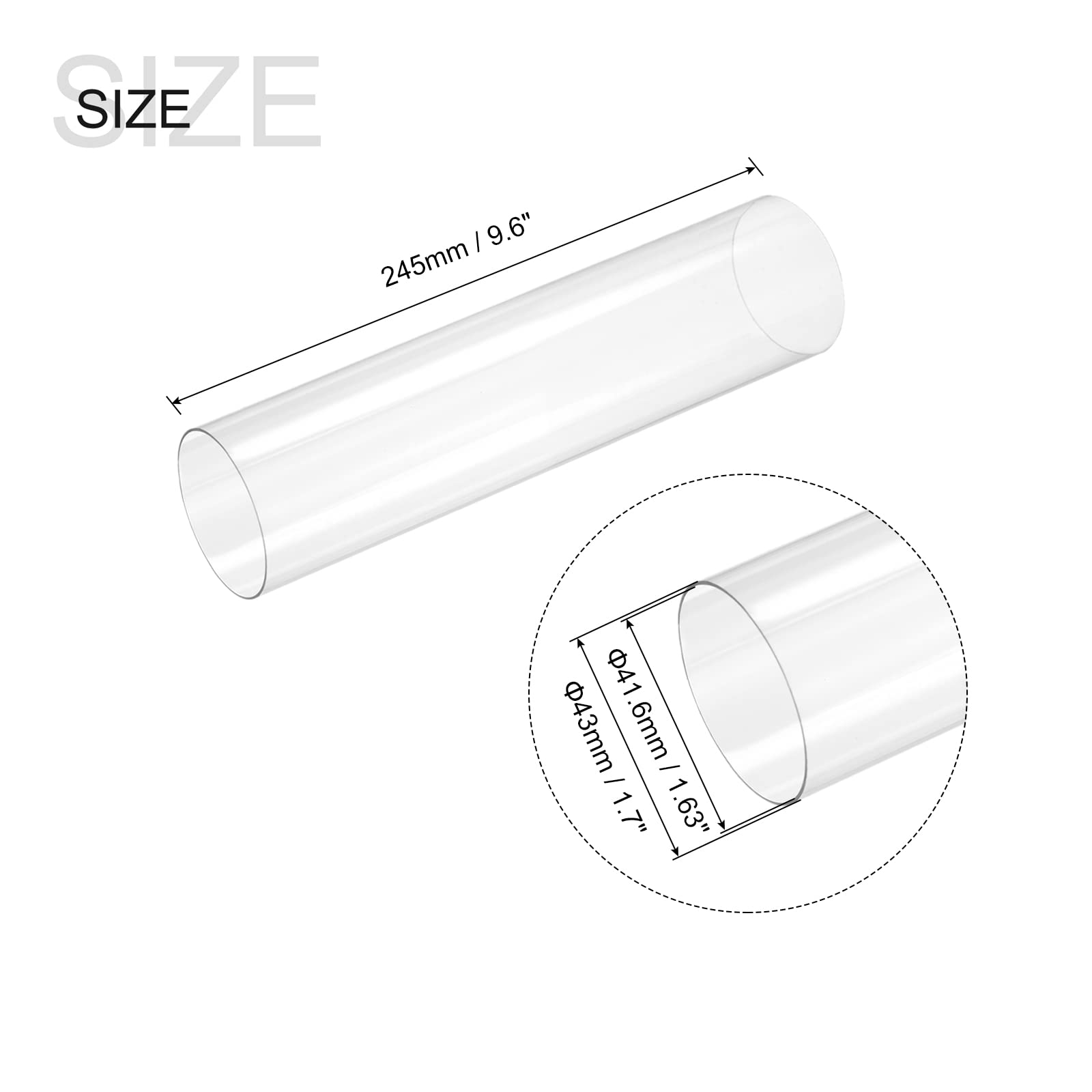 In the package of: 1pcs x Rigid Round Pipe; Length: 245mm/9.6 inch; Inner Diameter: 41.6mm/1.63 inch; Outer Diameter: 43mm/1.7 inch; Thickness: 0.7mm/0.03 inch