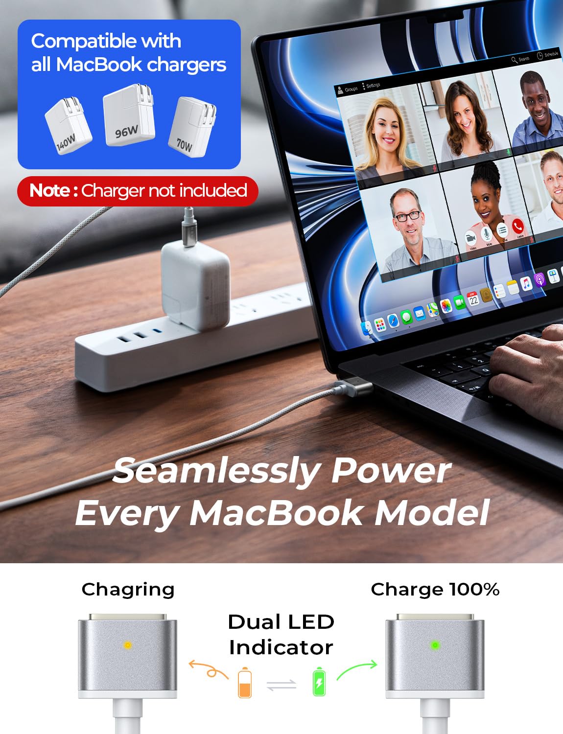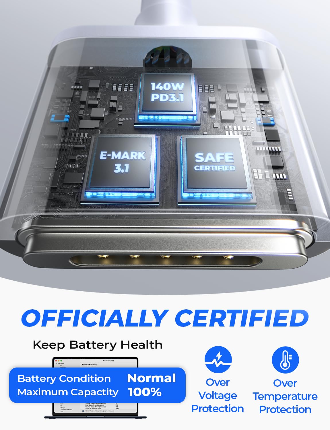 140W PD 3.1 Super Fast Charging: This Magnetic Gen 3 charging cable delivers 140W PD 3.1 super fast charging speed as OEMs, this usb c to Mag-Safe 3 cable powers your MacBook efficiently with a 96W or 140W adapter, reaching 50% in just 30 minutes. NOTE:While using certain power adapters, a slight 15-20 second delay in the charging process might occur due to our magnetic safety mechanism, but rest assured, it's a sign that your laptop is being well-protected