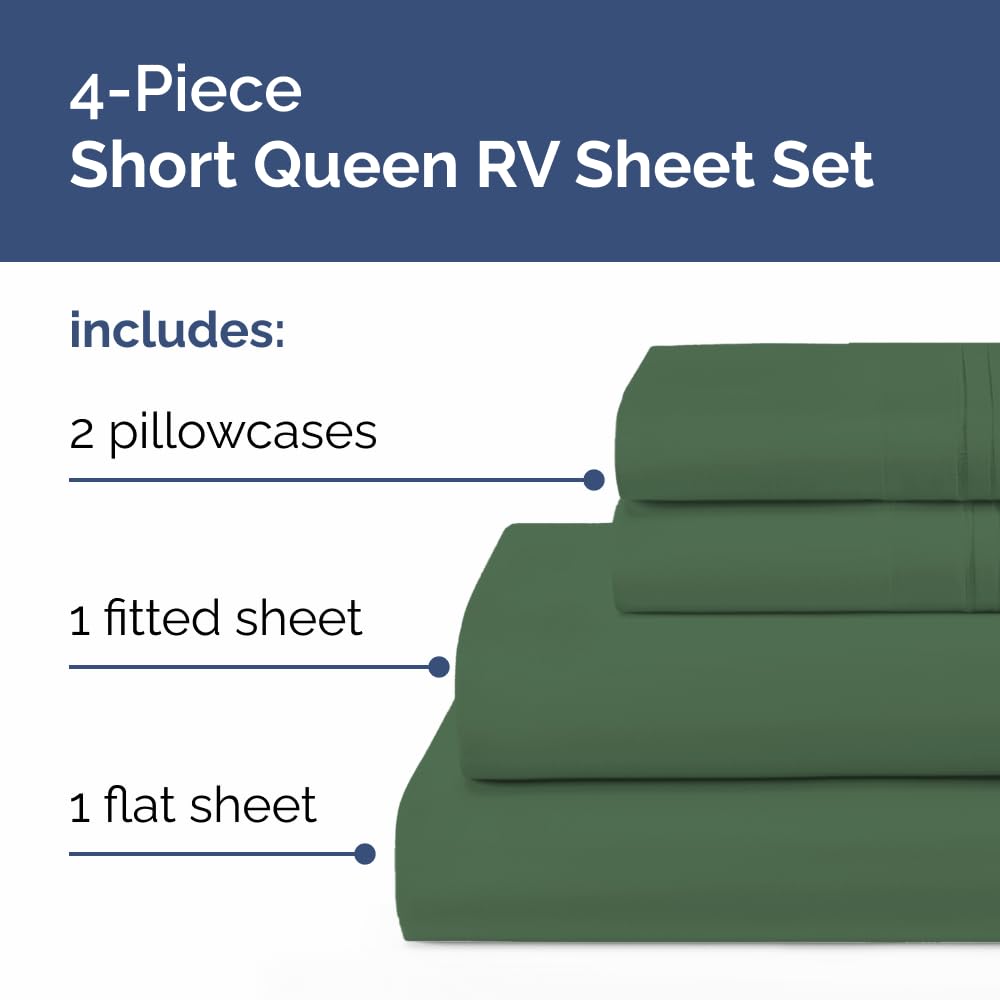 4 PIECE SHORT QUEEN SHEET SET: This Short Queen sheet set stays perfectly in place whether it is for a RV Short Queen Mattress or RV camper. It includes 2 pillowcases 20” x 30”, a Flat sheet 90” x 102” and a Fitted Sheet 60” x 75”. Our premium RV Short Queen sheets will allow you to enjoy a smooth, wrinkle-free bed without the hassle of constant adjustments or re-tucking—great for kids, teens, and growing families.