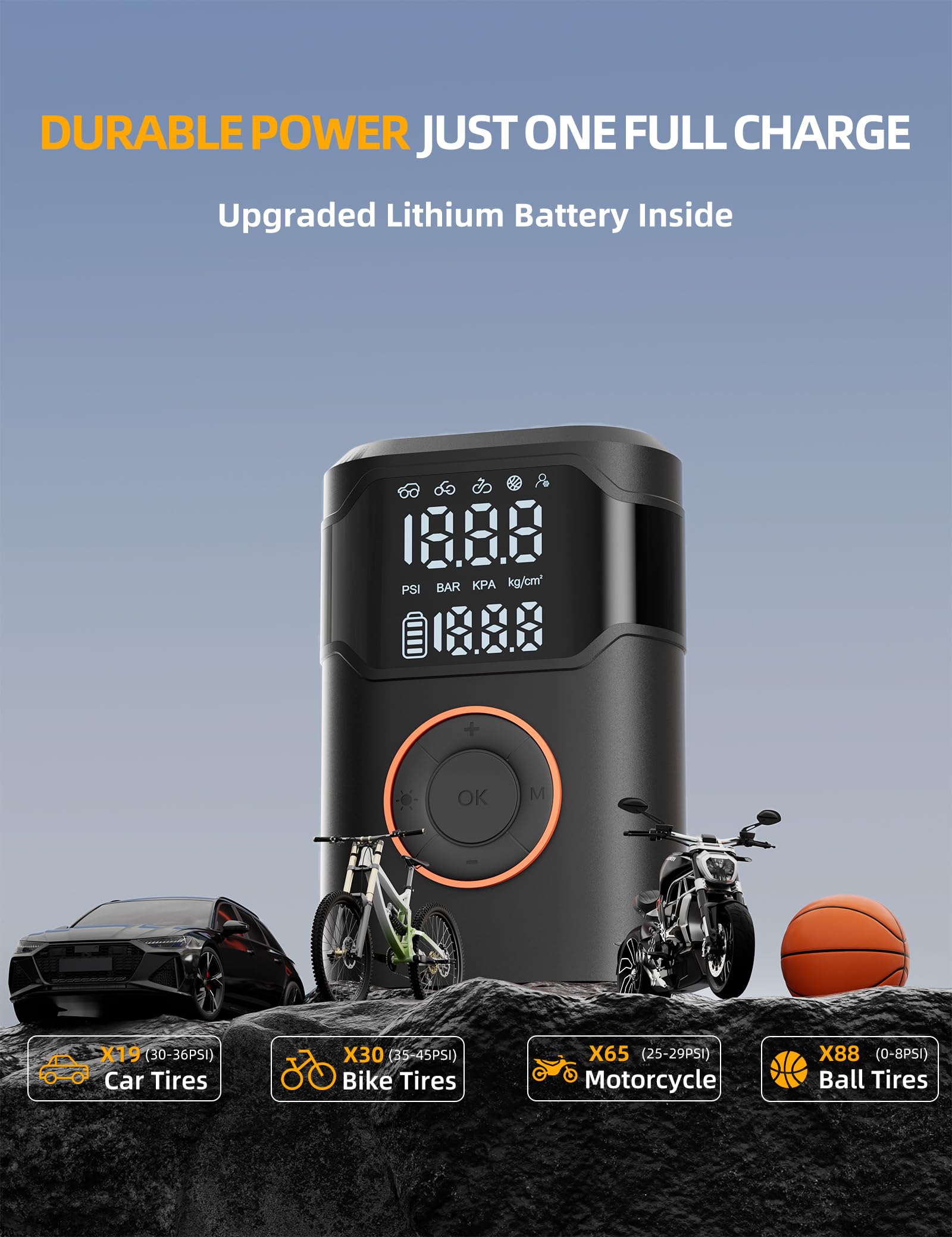 【Smart Display & Easy Operation】: Supports 4+1 smart modes (car, bike, motorcycle, ball, custom) with PSI/Bar/kPa/kg/cm² switching. The digital display shows real-time and preset pressure, and the portable air pump automatically stops at the target to prevent over-inflation. Custom mode supports 3–150 PSI, easily handling all DIY inflation needs. One-touch operation delivers precise, fast, and safe inflation.