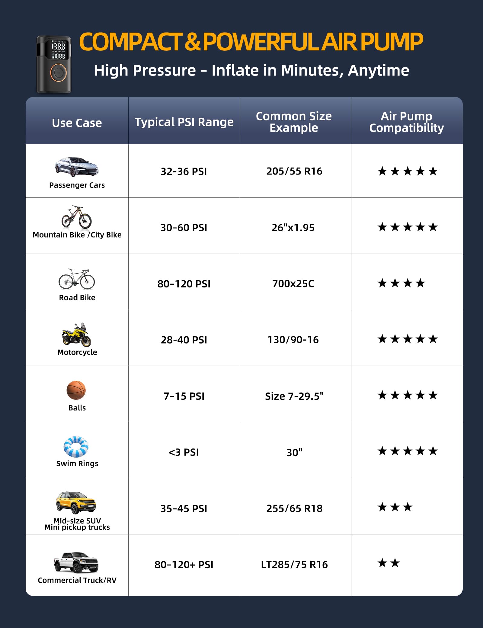【Powerful Performance · 5X Faster Inflation】: Inflate tires in a flash with the Tire Inflator Portable Air Compressor! Featuring a high-performance motor, built-in pressure gauge, and precise sensor, it delivers up to 150 PSI—pumping a 195/65R15 tire from 30 to 36 PSI in just 1 minute, 5X faster than ordinary pumps. Whether you need a reliable tire inflator for your car or a compact bike pump for cycling adventures, it’s perfect for emergencies, road trips, or daily maintenance.