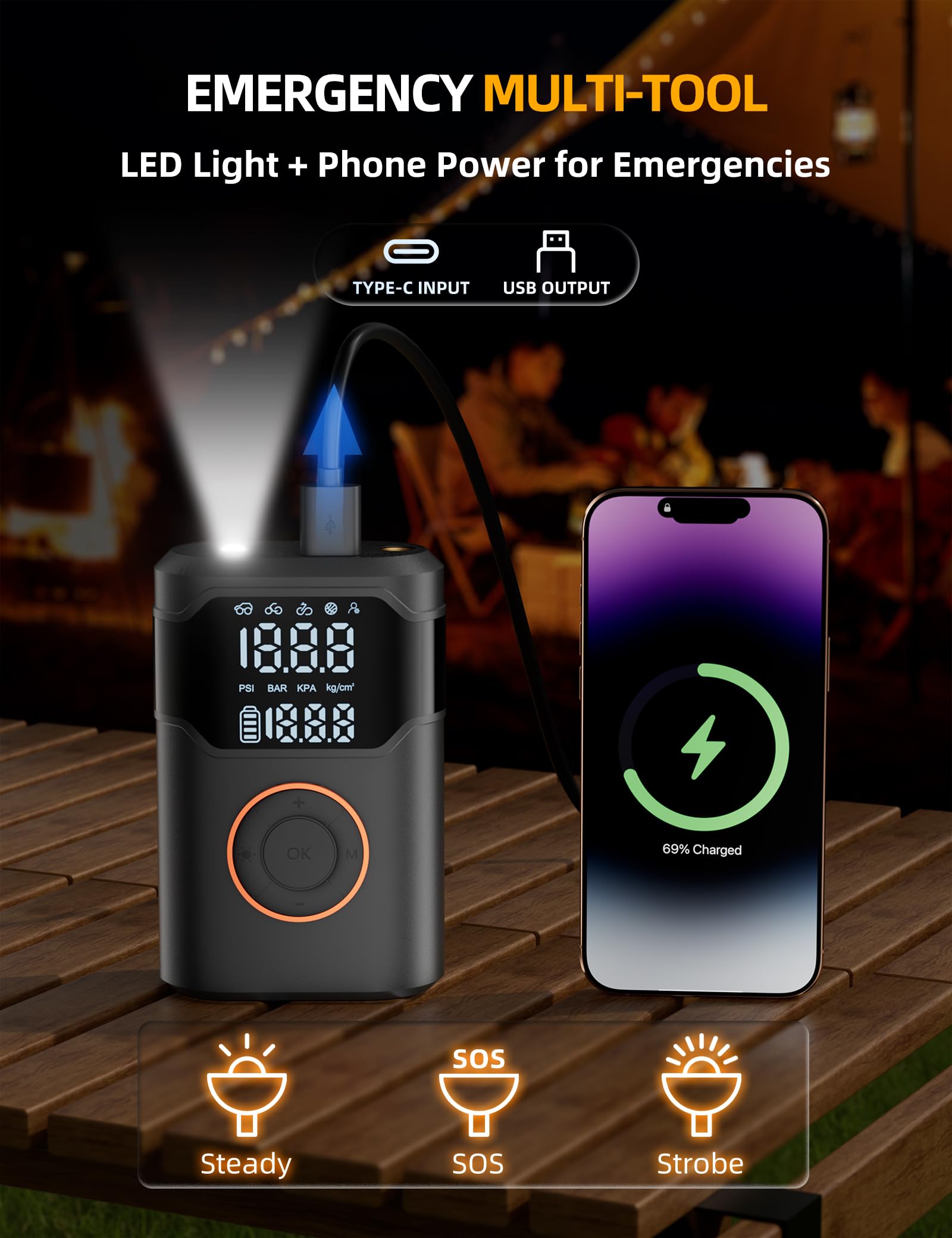 【Multi-Function Emergency Tool】: Never waste time driving miles to paid air stations or hunting for a pump again. This portable mini inflator serves as your car tire inflator, bike air pump, e-bike inflator, and works with balls, air mattresses, and other inflatables. Equipped with a USB output, it can also power your phone or other devices in emergencies. Built-in LED flashlight with steady, strobe, and SOS modes ensures safe and convenient use anytime—even at night.