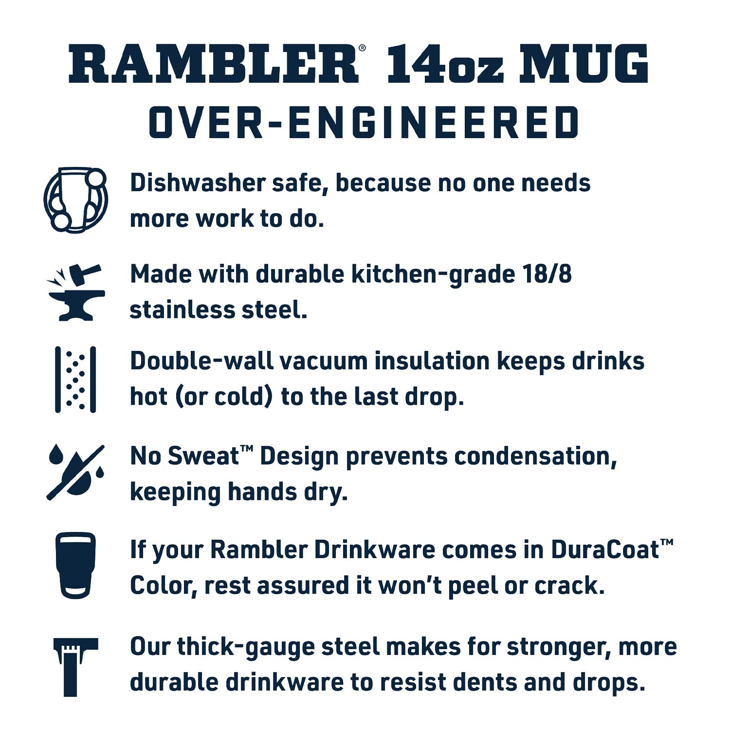 YETI Ramblers are BPA-free, dishwasher safe, and have a No Sweat Design to make sure your hands stay dry. The tough Duracoat coating on the colored tumblers won’t crack, peel or fade