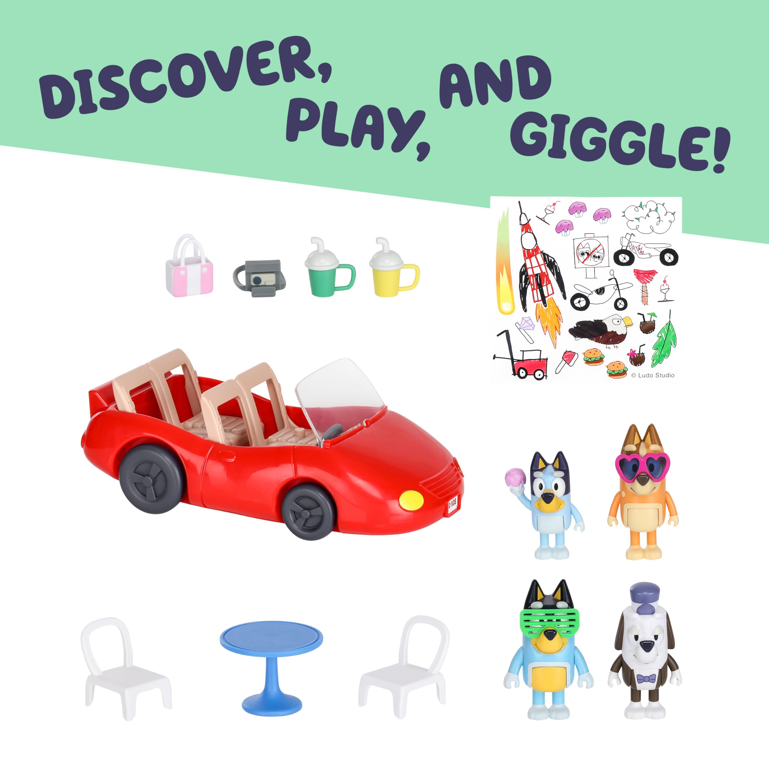 Escape Convertible Playset: Get ready for a fun road trip with our Bluey car toy playset inspired by the Bluey TV show episode “Escape”; this kids toy car pack includes a bright red escape convertible, 4 figurines, a sticker sheet, and 9 accessories.