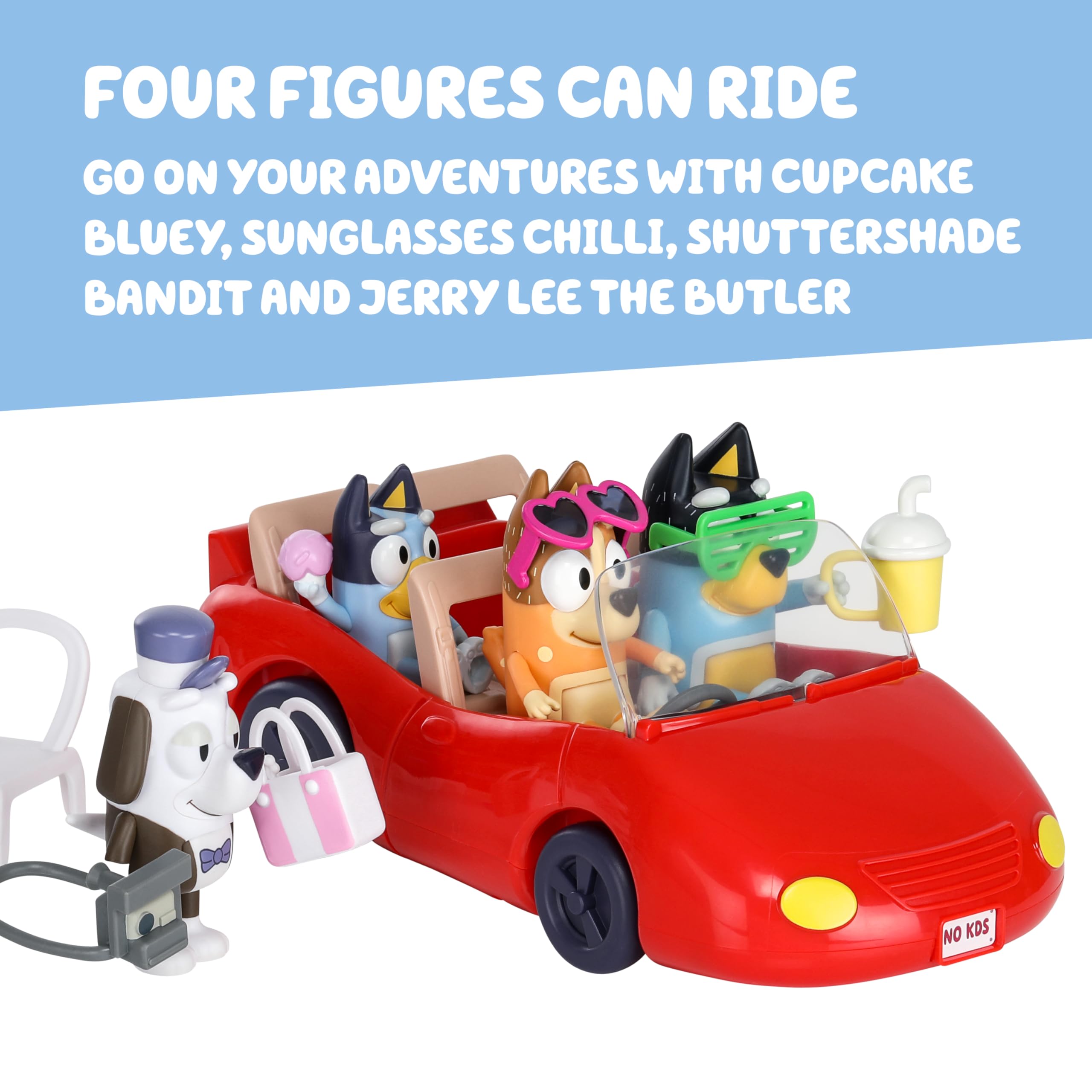 Bluey Vehicle & Figures Toddler Car Toy Playset: Bring the excitement of a Bluey-style road trip home with our escape convertible toddler cars playset, inspired by the beloved episode “Escape”. This toddler toy cars set includes a bright red convertible, four Bluey character figures, a sticker sheet, and nine detailed accessories for a complete playtime adventure. The kids push car playset features Cupcake Bluey, Sunglasses Chilli, Shuttershade Bandit, and Jerry Lee the Butler, each standing 3 inches tall with movable arms and legs for dynamic posing and storytelling. With accessories like a table, chairs, food, drinks, and a camera, kids can dive straight into imaginative play with no setup needed. The convertible Bluey toddler car comfortably seats all four figures and includes stickers inspired by Bluey and Bingo’s silly drawings, adding an extra layer of creativity. Perfect for young fans and collectors alike, these Bluey toys combine open-ended play, detailed design, and character-driven fun to create adventures filled with imagination and endless playtime fun.