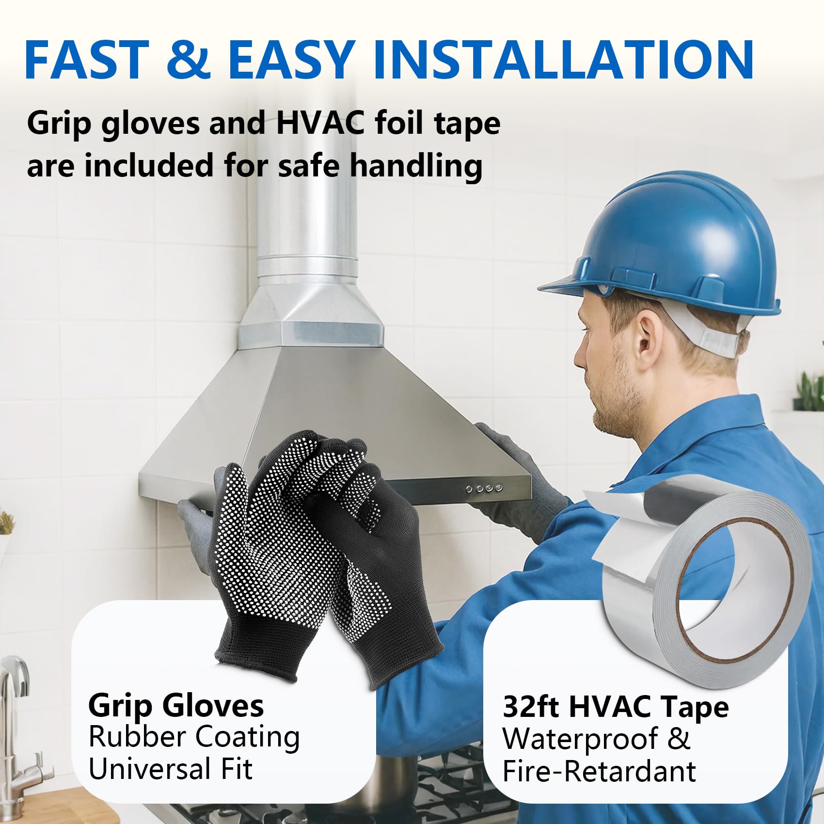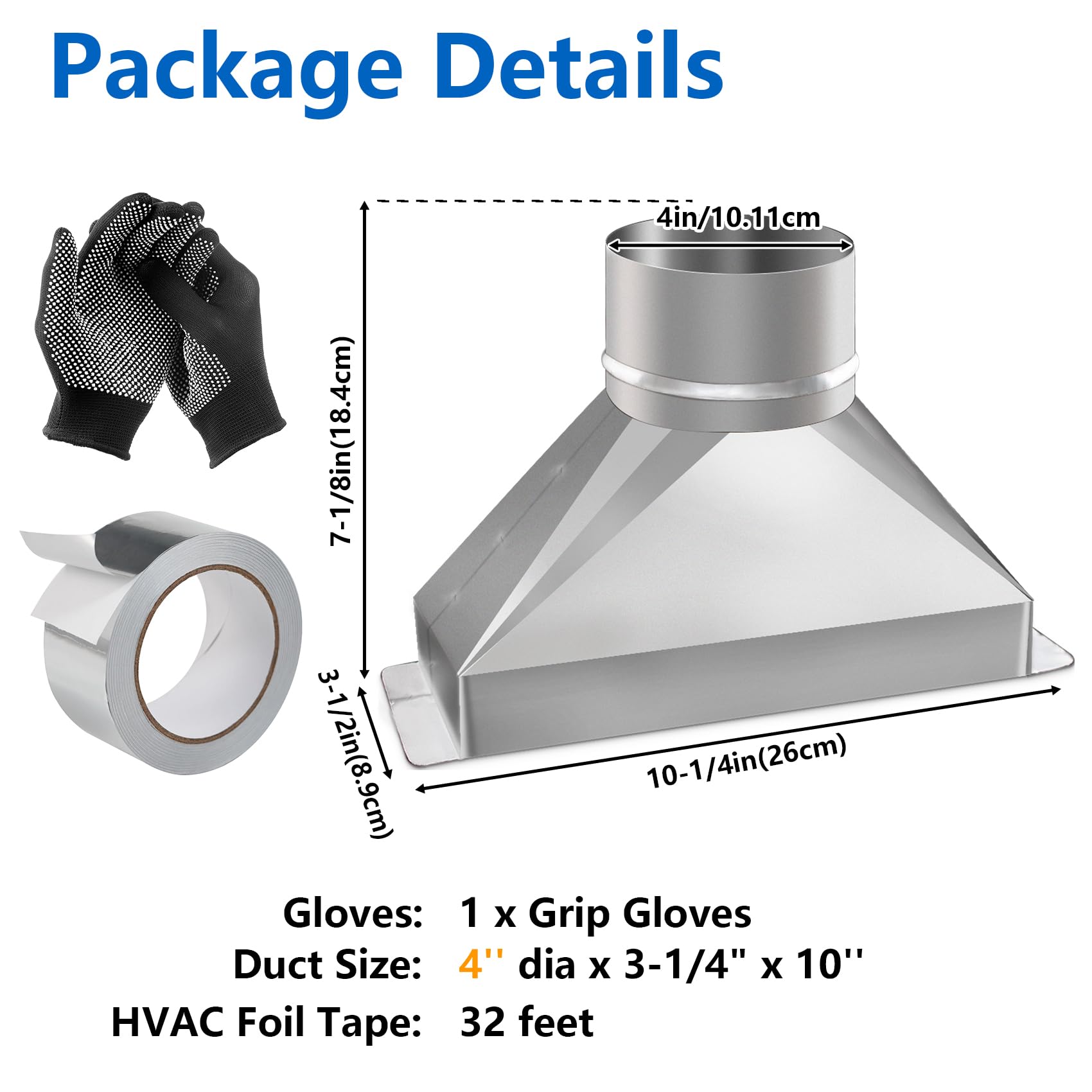 【Complete Ventilation Kit】Includes 1 galvanized rectangular to round duct transition, aluminum foil tape(10m/32ft), and work gloves—everything you need for a quick and efficient installation.