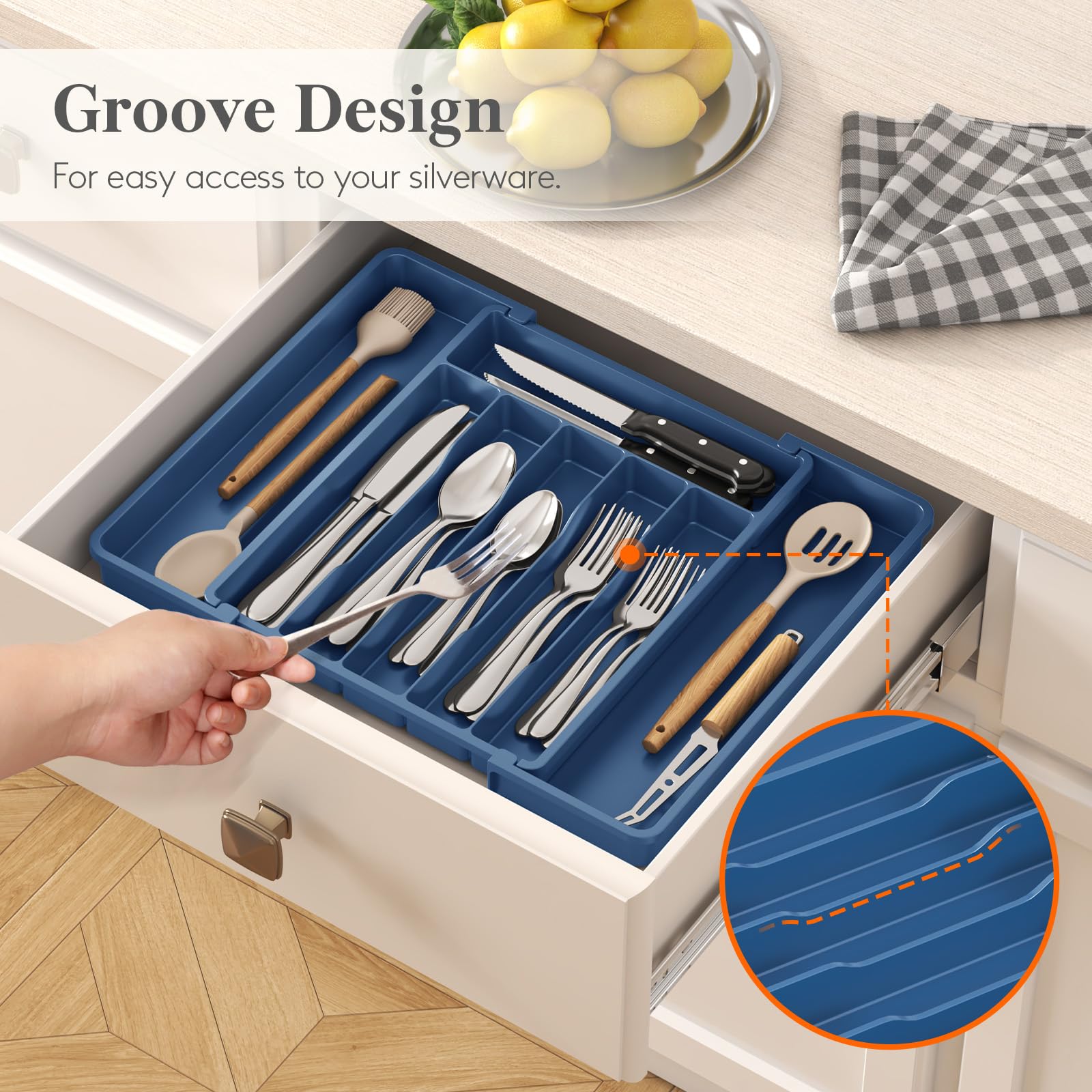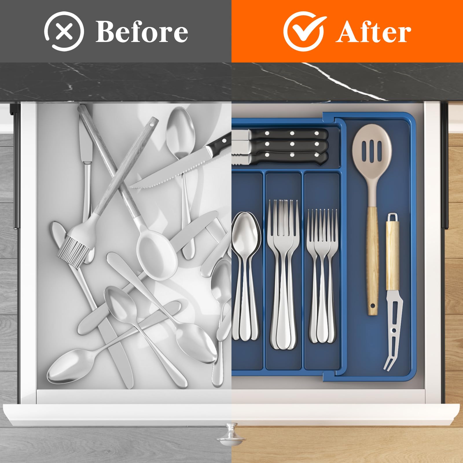 Suitable Capacity: Organize your kitchen drawer and make more space with the silverware organizer. Comes with two expandable panels on the left and right to store more silverware, cutlery, and kitchen utensils