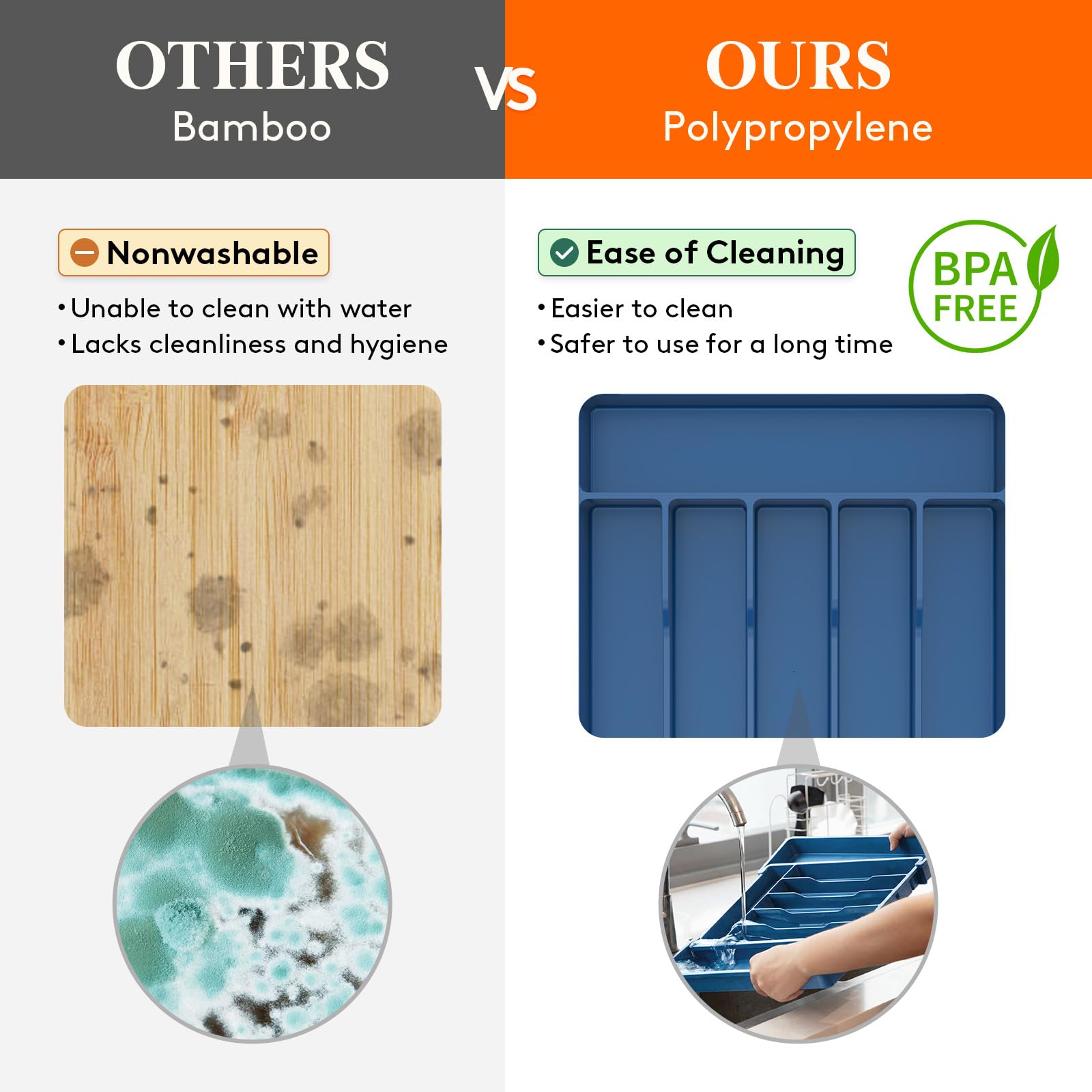 Premium Material: Made of thick and sturdy premium PP material, the cutlery organizer is BPA free so you can rest assured that it is safe to use with all forms of tableware. The durable construction means it is built to last for a long time