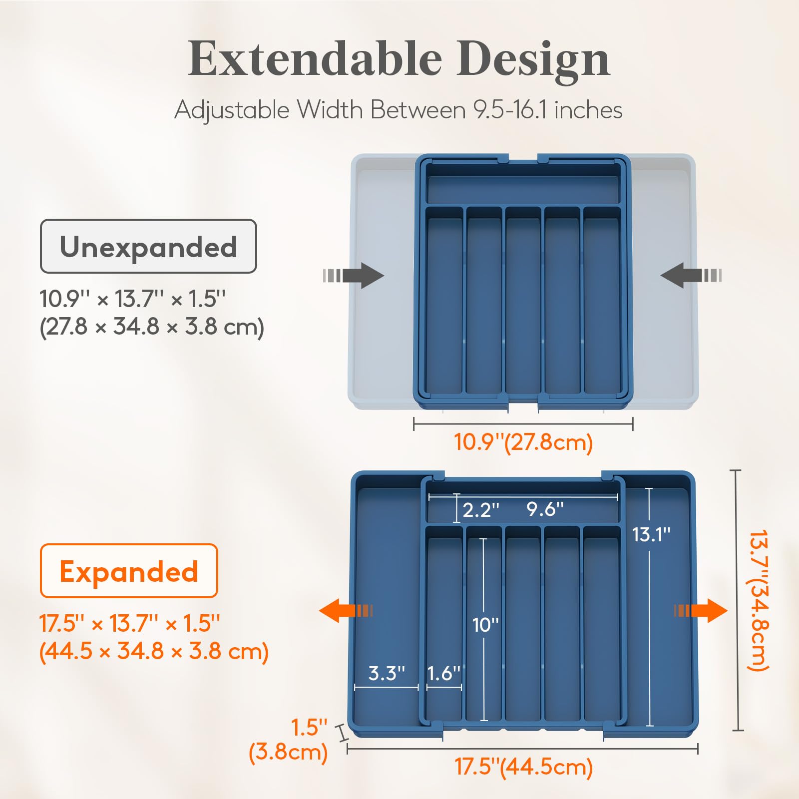 Adjustable Size: With an adjustable width between 10.9-17.5 inches, it is compatible with different drawer sizes. When fully expanded, the cutlery box dimensions are 17.5 x 13.7 x 1.5 inches and when fully folded, it reduces to 10.9 x 13.7 x 1.5 inches. So no matter what size your kitchen drawers are, this utensil organizer will surely fit in