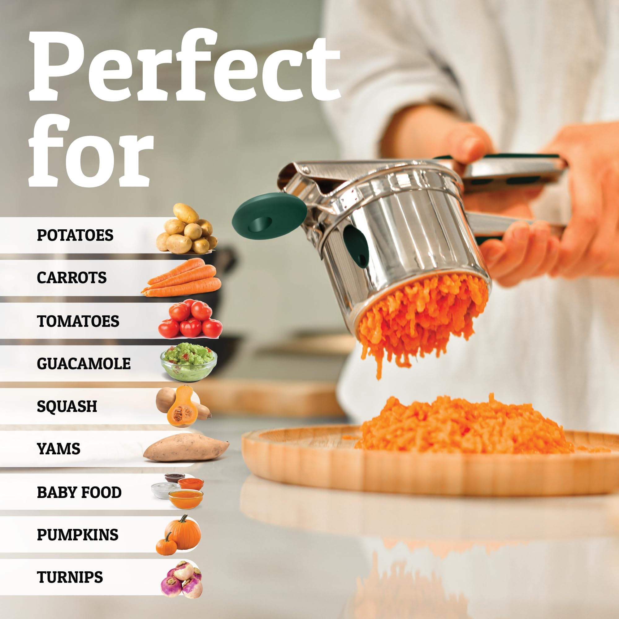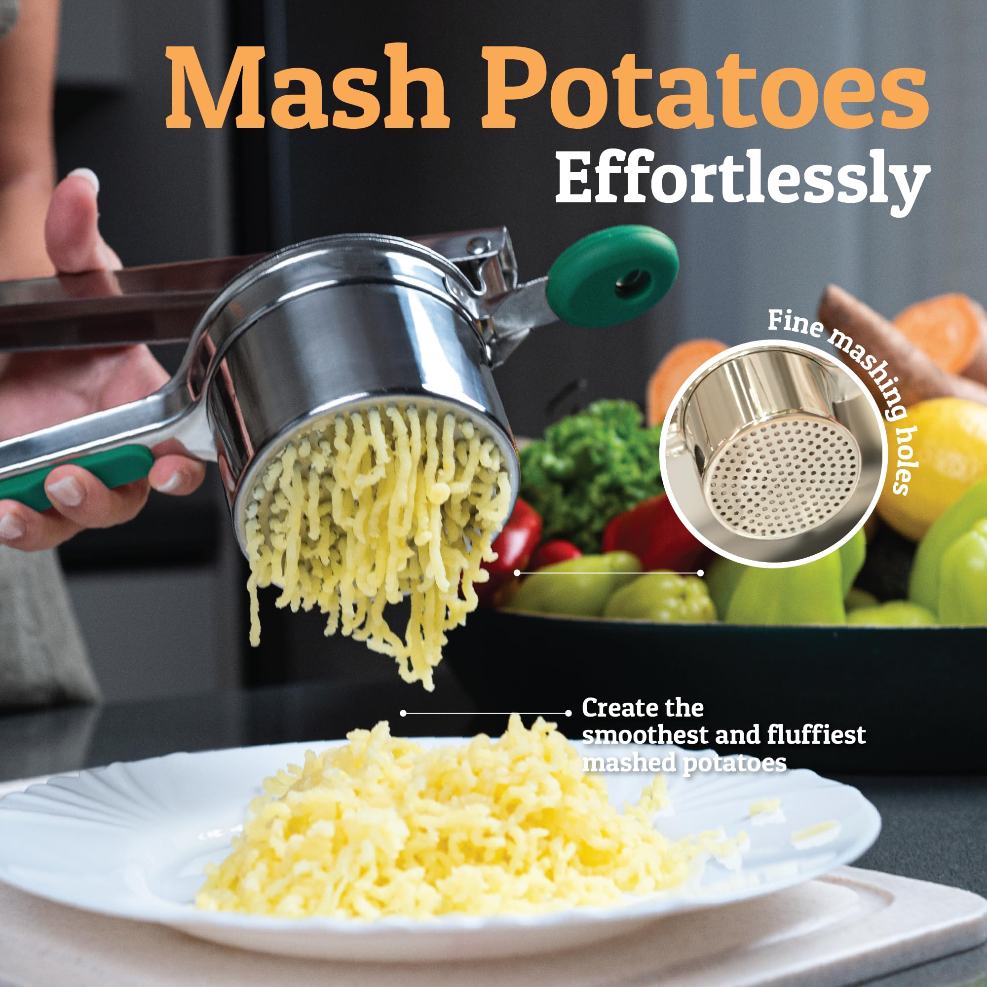 Large Deep Basket For Quicker Ricing - Holding a max capacity of 15oz, 3mm ricer holes, you will have your mashed potatoes prepared quicker yet finer output than using other kitchen gadgets. You can also use it for other veggies like soft carrots, turnips, yams and even use a baby food masher