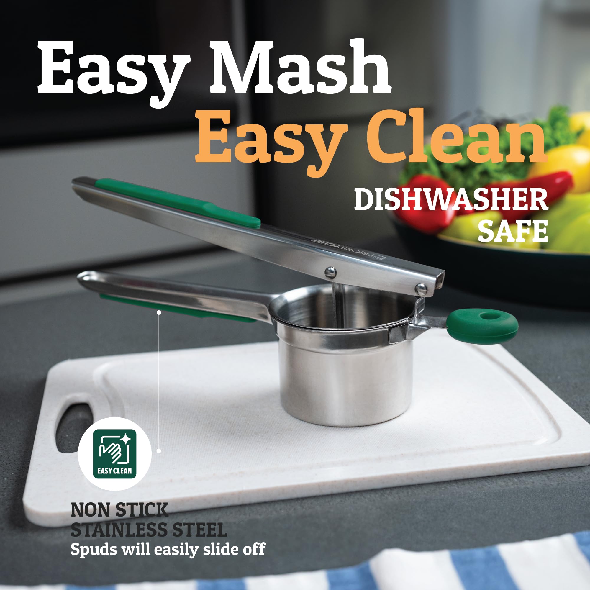 Easy Clean Up - Top Rack Dishwasher Safe - Crafted from 100% rust-proof, high-quality materials, the PriorityChef potato ricer is resistant to stains, corrosion, and deformation. And with its non-stick material, the spuds will simply slide off. Any food residue is easily rinsed off with running water. It's easy to use and easy to clean