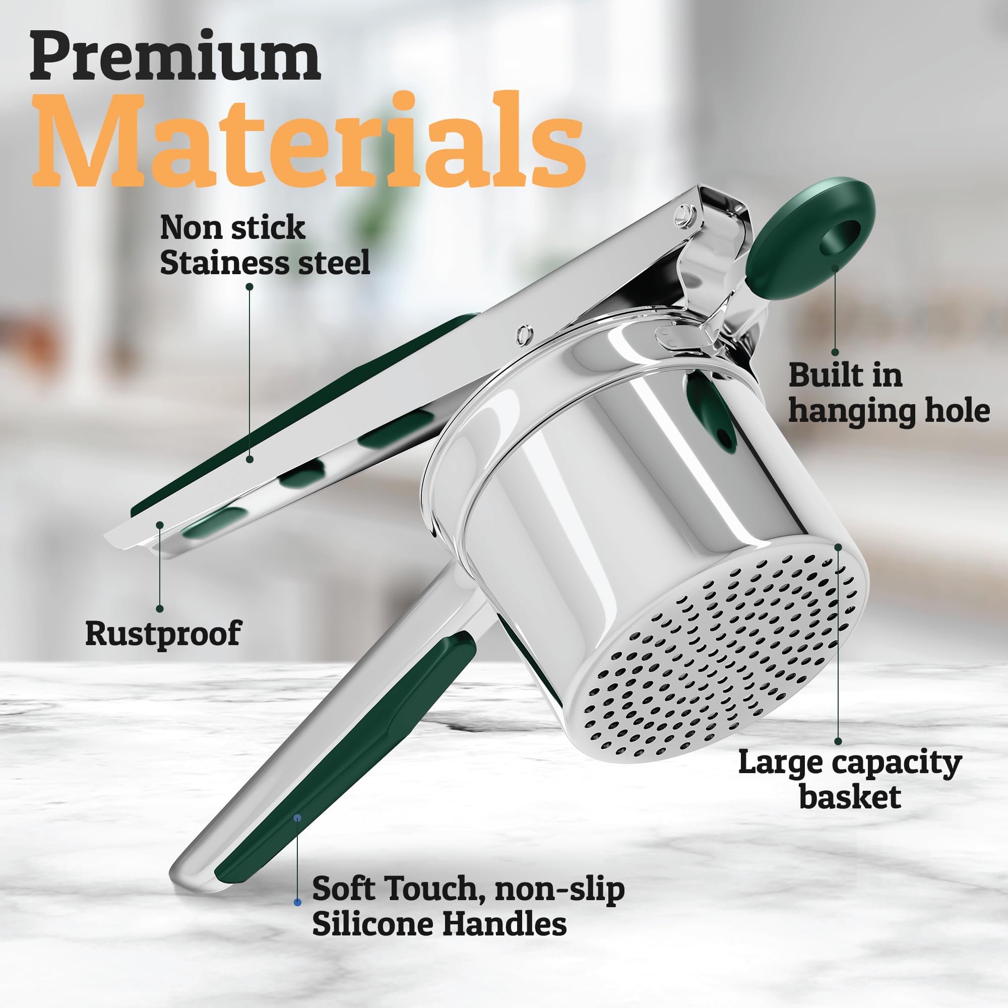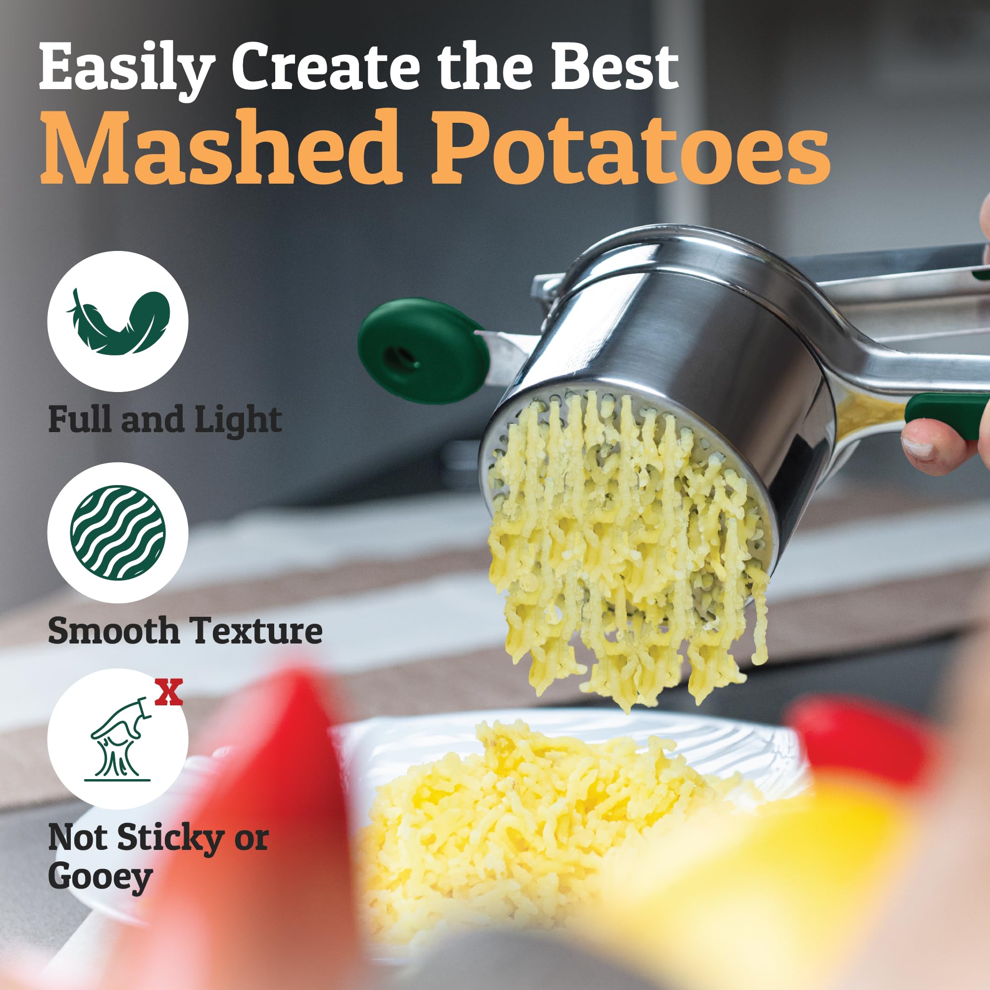 Anti-Slip, Cushioned Long Handles For Easy Leverage - Our potato ricer's long easy-grip silicone handle allow comfortable leverage while you mash, rice, and mill. No more sore or tired arms just perfect results, every time