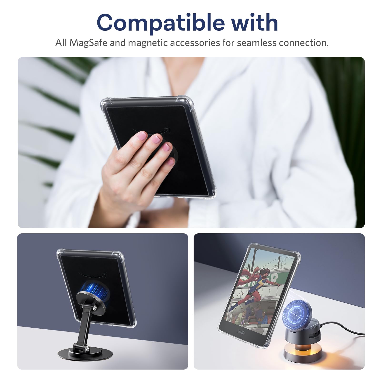 Compatible with MagSafe: Be at the forefront of innovation with a Kindle case that is compatible with MagSafe, Anker, and Samsung wireless charging pads. No need to remove the case, this feature screams modern convenience and sophistication.