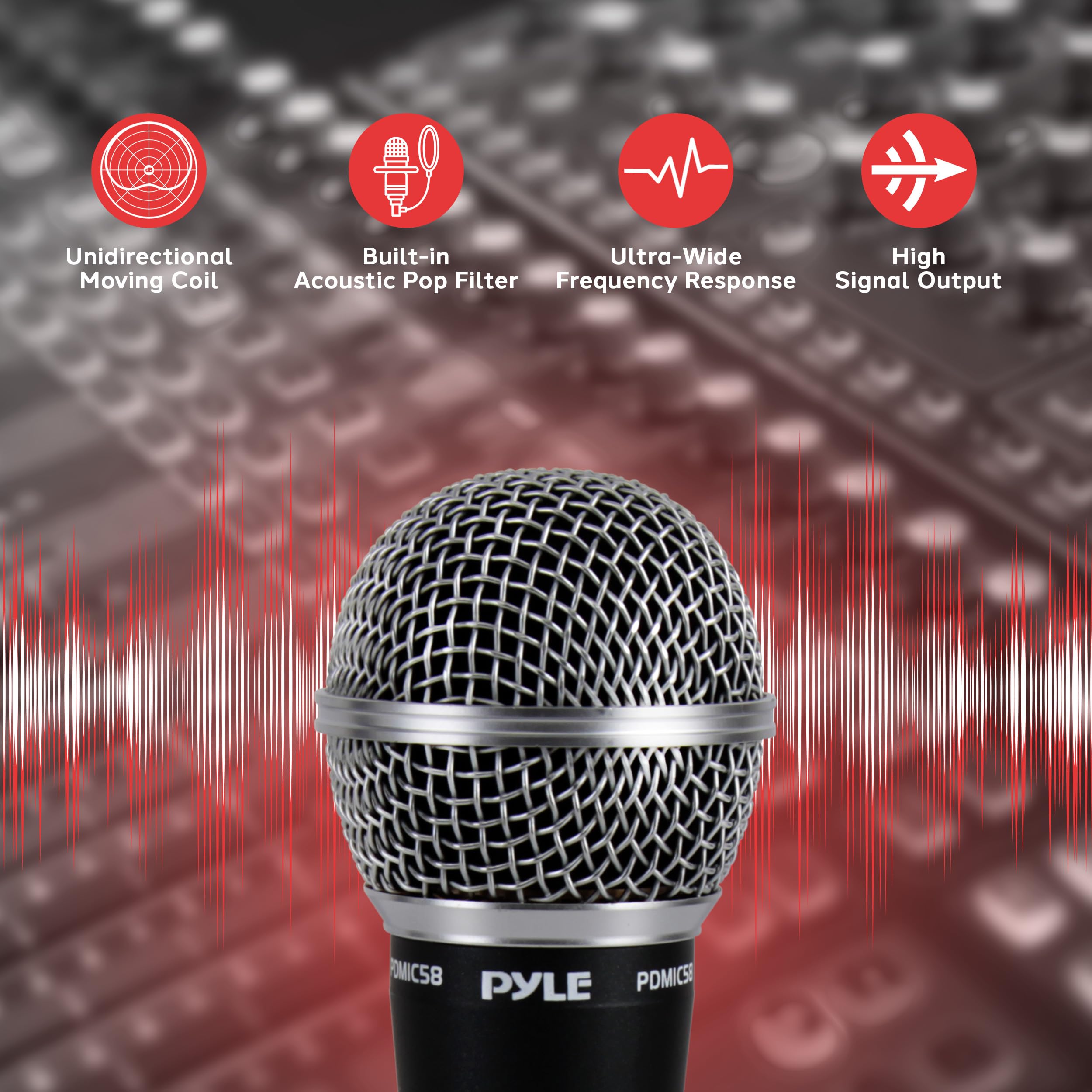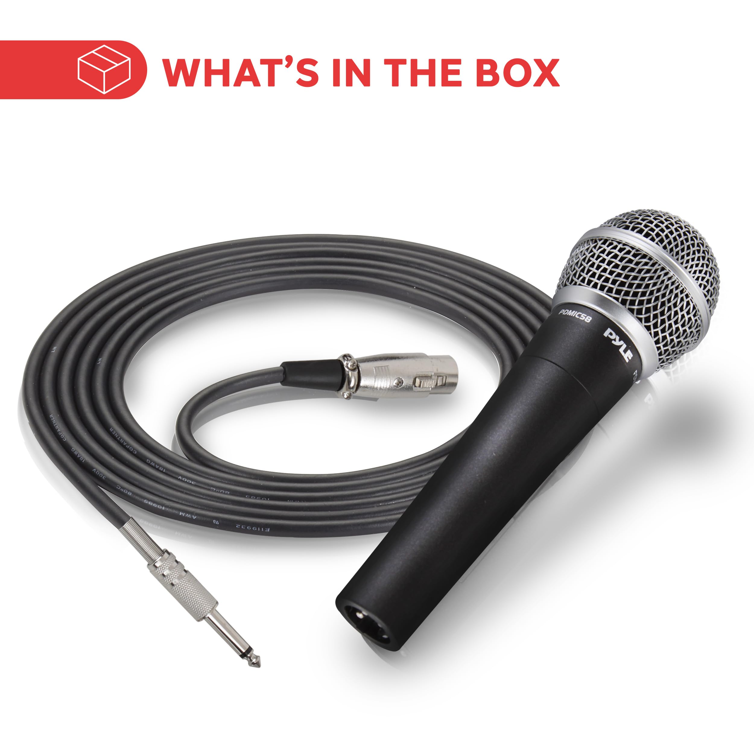Elevate your audio setup with the Pyle Professional Dynamic Microphone 2-Pack, delivering exceptional sound clarity and versatility. Perfect for live performances or studio recordings, each microphone features a built-in acoustic pop filter to minimize distortion and enhance vocal quality. Whether singing, presenting, or recording, this set ensures professional-grade audio every time. Optimized for karaoke enthusiasts, this karaoke microphone set offers unidirectional sound capture that isolates vocals while reducing background noise. Crafted with rugged zinc alloy bodies and steel mesh grills, these dynamic microphones are built to endure regular use while maintaining top-notch performance. Each wired microphone comes with a 15-foot XLR to 1/4'' audio cable, providing flexibility and convenience for a seamless setup. Perfect for duets, multi-performer setups, or ensuring you always have a reliable backup, this 2-pack delivers dependable, high-quality audio performance. Designed for performers and professionals alike, this handheld microphone set is ideal for stage performances, studio recordings, and karaoke nights, offering the durability and sound quality you can count on.