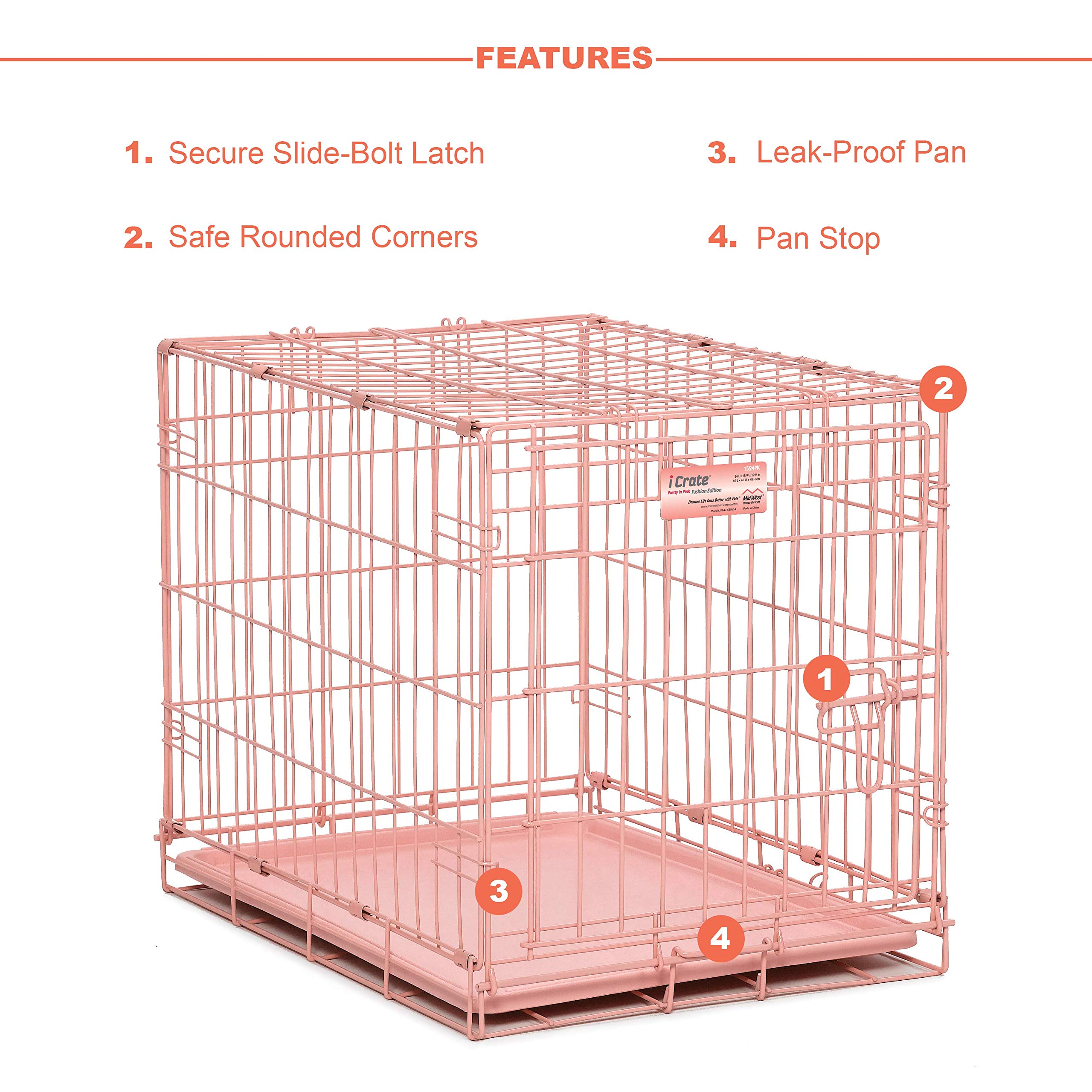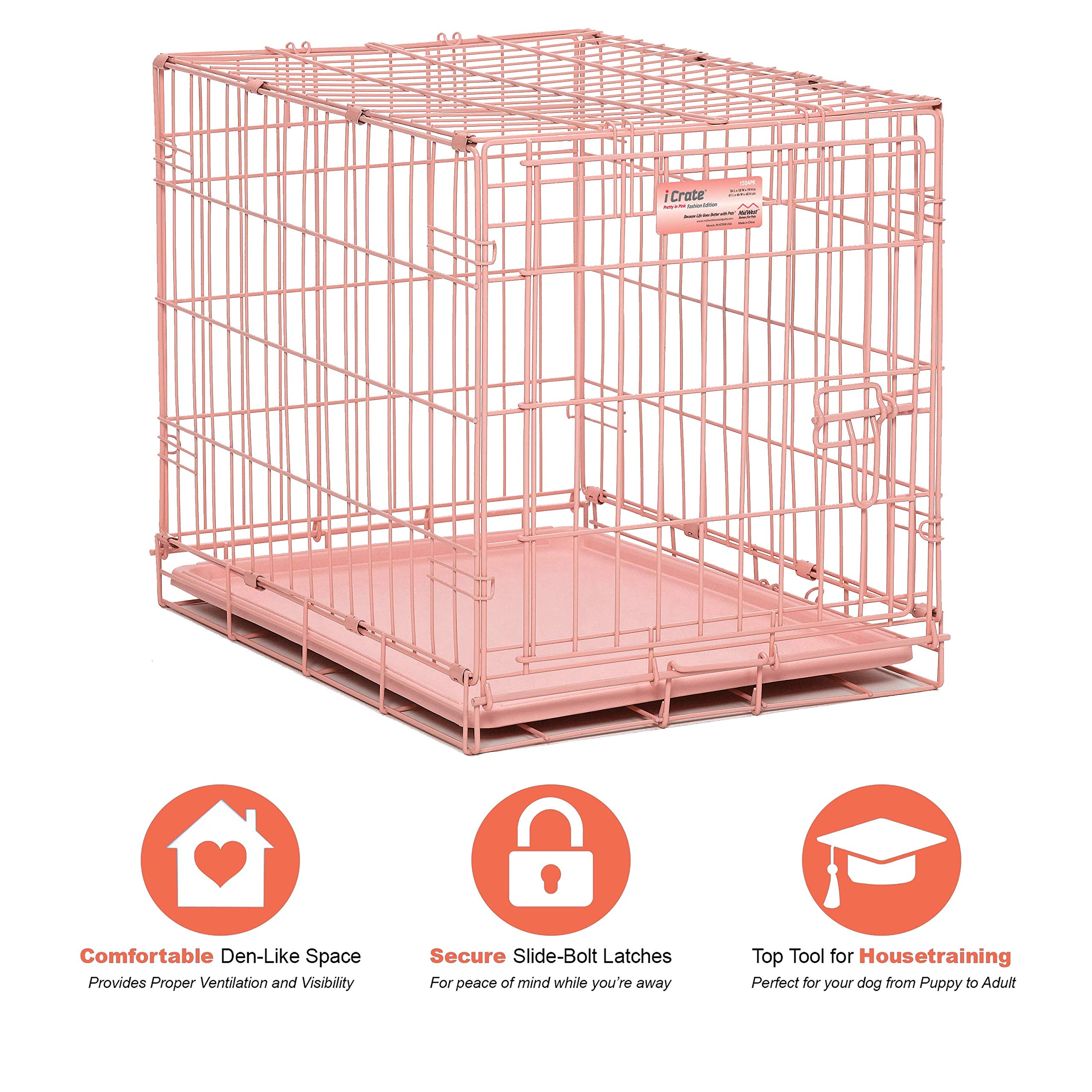 Give your dog a safe, comfortable place to call their own with the MidWest Homes for Pets Fashion iCrate Single Door Dog Crate. This stylish pink metal wire dog crate features newly enhanced security features, including a patented Paw Block and locking tips on the slide-bolt latch – so you can feel confident your pet is secure whether they're relaxing at home or hitting the road with you. Designed with both pets and parents in mind, iCrate dog crates come complete with a divider panel (to grow with your puppy), a durable leak-proof pan for easy cleanup, rubber feet to protect your floors, and a carrying handle for added convenience. Plus, you can fold it flat in seconds without tools, making it perfect for travel, storage or quick set-up anywhere you need it – from your living room to a beachside vacation rental. Built from precision-welded metal wire with a pink e-coat finish that brings a touch of warmth to your home, the iCrate is durable enough for everyday use while resisting rust and wear over time. Larger openings and low thresholds make it easier for your dog to enter and exit the crate, easing the crate training process and helping them feel more at home. At MidWest Homes for Pets, we know your dog is family. That's why every crate is backed by a 1-Year Manufacturer's Warranty and supported by our Indiana-based customer care team, making the iCrate a trusted choice for creating a secure, comfortable home for your dog.