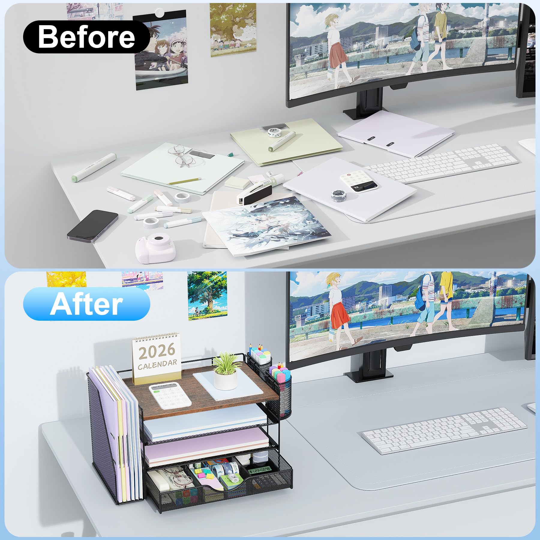 📂【Save Space】: The office organizer fully utilizes the vertical space of the desktop, creates the largest possible storage space, accommodates various office desk accessories, and saves space.