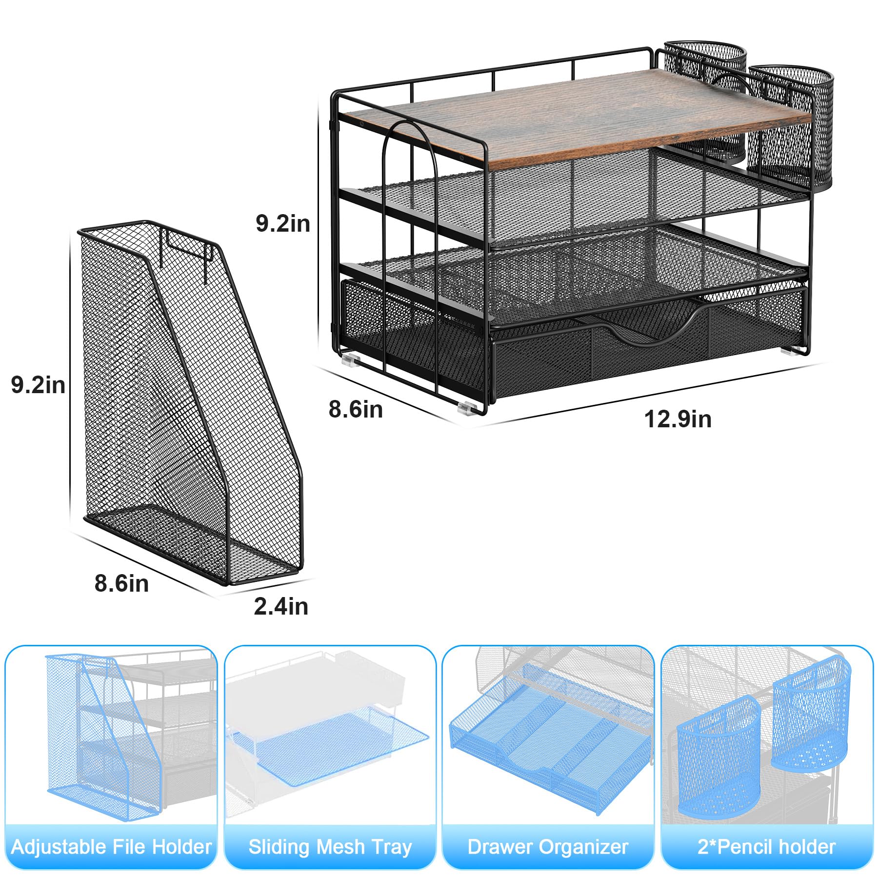 📂【High Quality Material】: The file organizer is made of durable metal mesh and premium woodand solid steel, which has better stability and durability, and the outer layer is epoxy coated, which is rust-resistant and highly durable, ensuring a long service life.