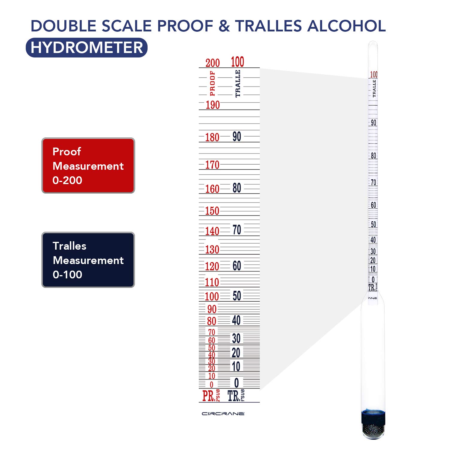 🧪[Proof & Tralle Double Scale Alcoholmeter]: 0-200 Proof & 0-100 Tralles accurate hydrometer for alcohol proofer testing spirits, high alcohol liquor, moonshine, corn whiskey, barrel aging dissipation, infusion batch and tincture recipes or other high alcohol content home distilling beverages for alcohol content measuring.