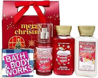 Bath & Body Works Winter Candy Apple Mini Gift Box Set with a Marbela Natural Oats Bar Soap - INCLUDES: 2.5 fl oz / 75 mL Travel Size Fine Fragrance Mist, 3 fl oz / 88 mL Travel Size Aloe + Vitamin E Shower Gel, 3 fl oz / 88 mL Travel Size Daily Nourishing Body Lotion, Winter Candy Apple - Fragrance: red apples, winter rose petals, candied oranges, maple leaf and fresh cinnamon. Box measures 6.75" H x 5.75" W.