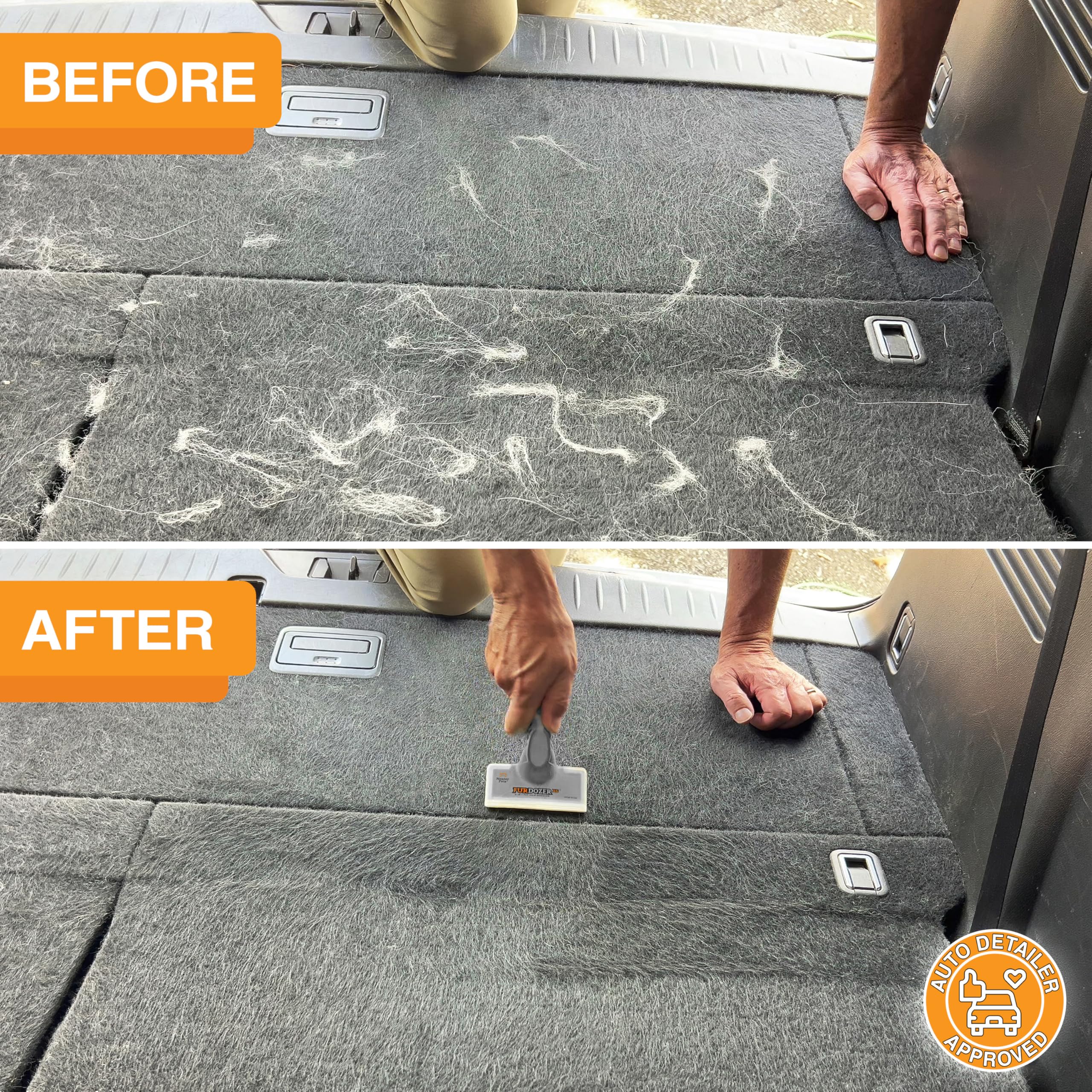 WORKS ON MULTIPLE SURFACES & WON'T DAMAGE FABRICS: The FurDozer combines a patented revolutionary design with hi-tech materials to work on multiple surfaces. You can use it as a carpet hair removal tool, pet hair detailer for car, dog hair remover for couch, and more! Unlike other pet hair rakes, the FurDozer is made of a gentle rubber that will not destroy or damage delicate fabrics like wool, silk, plush carpets and rugs, or the side panels of a car interior.
