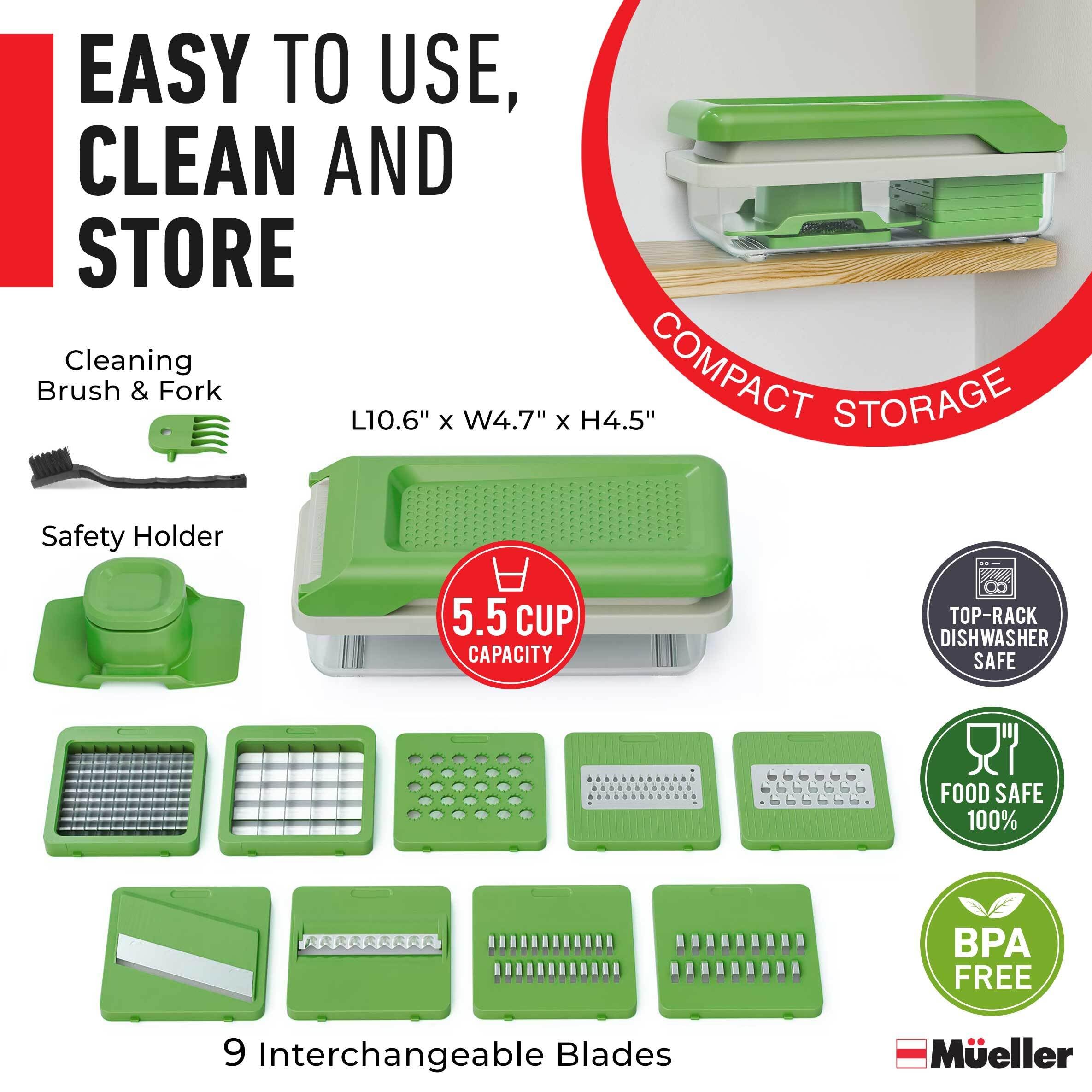 Revolutionize your kitchen experience with this all-in-1 kitchen gadget, combining the functions of a vegetable chopper, mandoline slicer, cheese grater, into one compact and efficient device. The Mueller chopper offers unparalleled versatility with 9 high-quality, interchangeable stainless-steel blades, perfect for dicing, slicing, grating, and chopping all your favorite vegetables and fruits. The included container ensures mess-free prep.