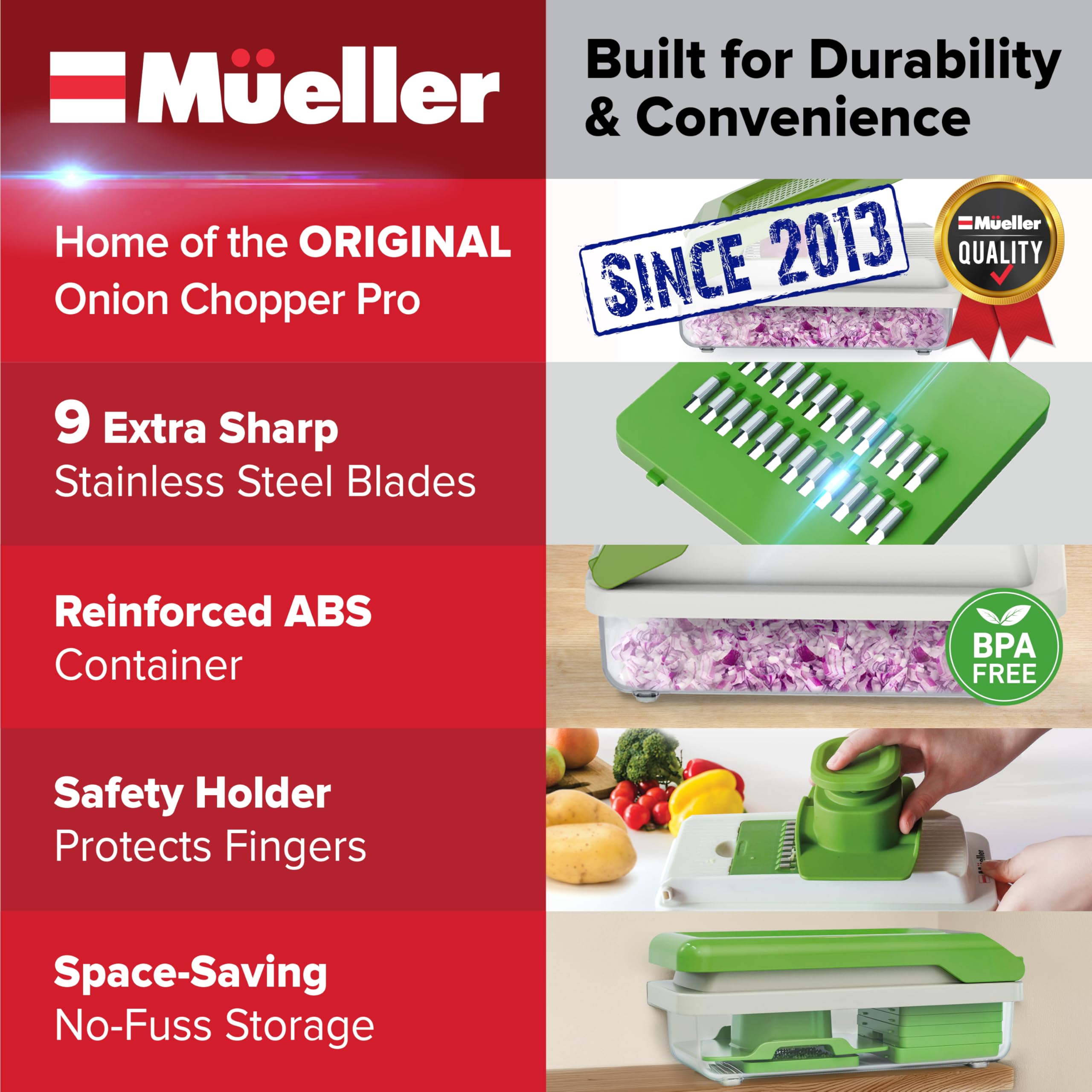 The Original Pro Chopper Refined Since 2013 - Another well marketed lower quality white/black model claims to be the original. More restaurants use Mueller than all the others combined because of our quality.. Effortlessly chop, slice, and dice your ingredients with ease using our tough as nails chopper. It's simple to use, set up, and clean, saving you time and energy during meal preparation. Become a kitchen pro with this must-have kitchen tool.
