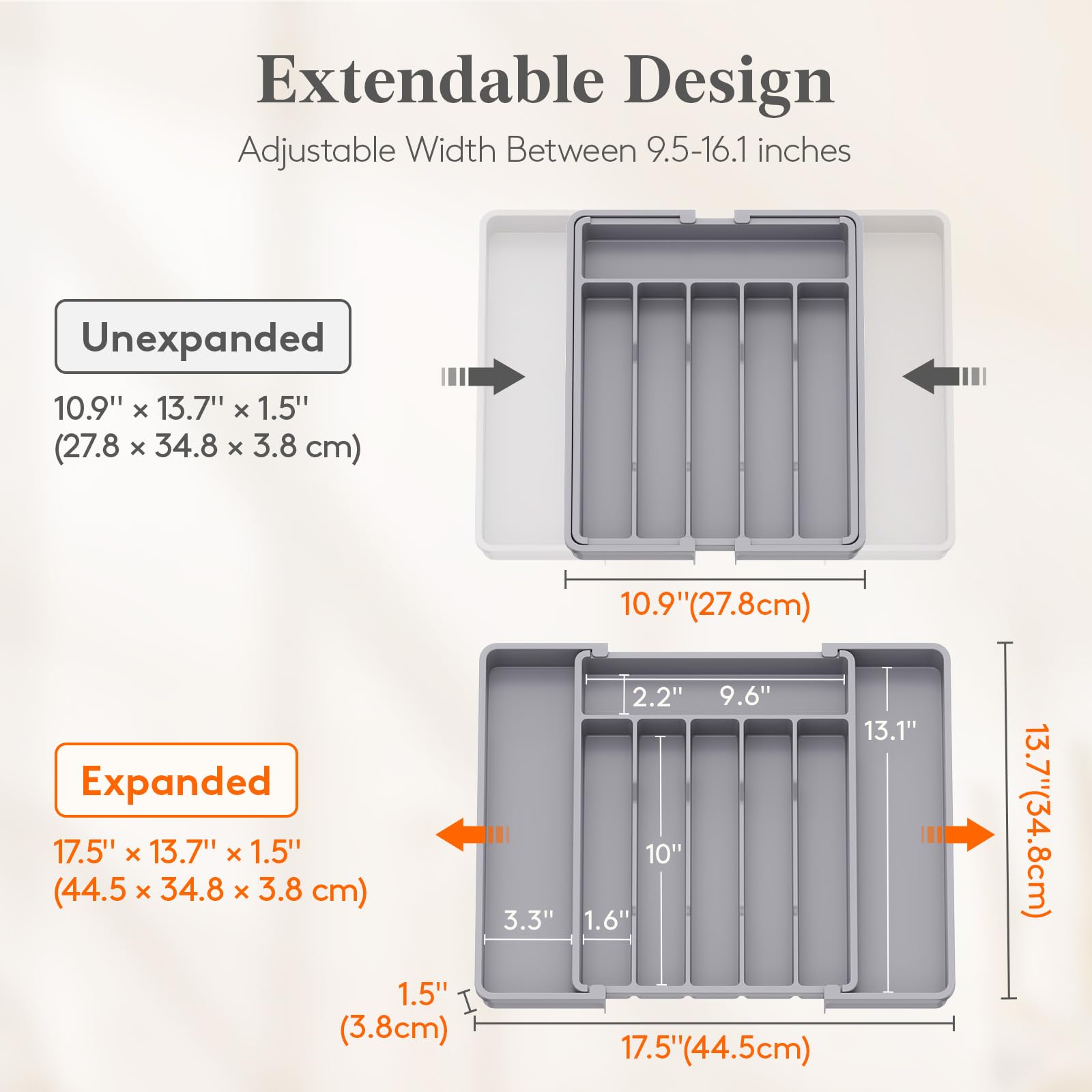 Adjustable Size: With an adjustable width between 10.9-17.5 inches, it is compatible with different drawer sizes. When fully expanded, the cutlery box dimensions are 17.5 x 13.7 x 1.5 inches and when fully folded, it reduces to 10.9 x 13.7 x 1.5 inches. So no matter what size your kitchen drawers are, this utensil organizer will surely fit in