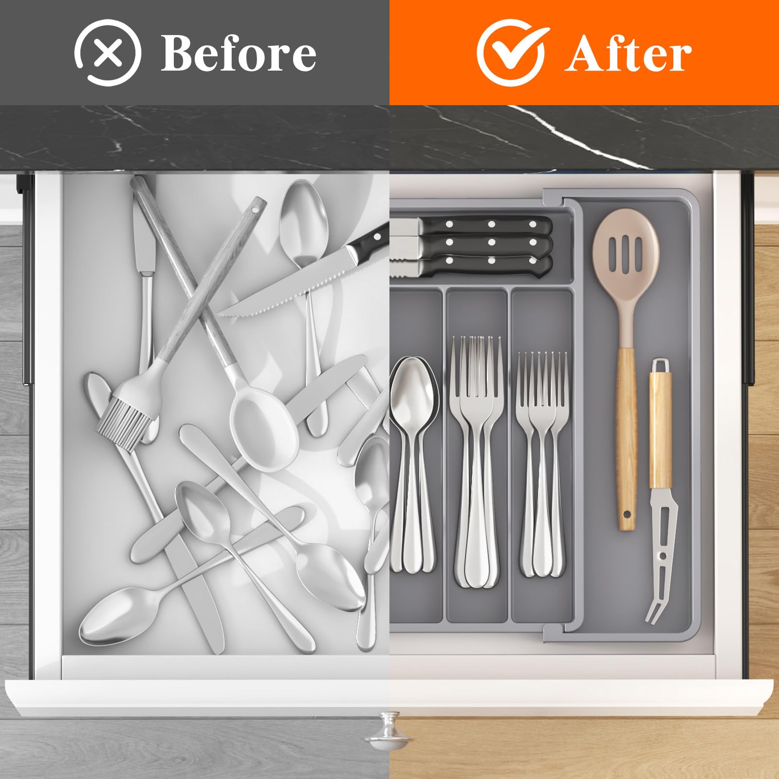 Suitable Capacity: Organize your kitchen drawer and make more space with the silverware organizer. Comes with two expandable panels on the left and right to store more silverware, cutlery, and kitchen utensils