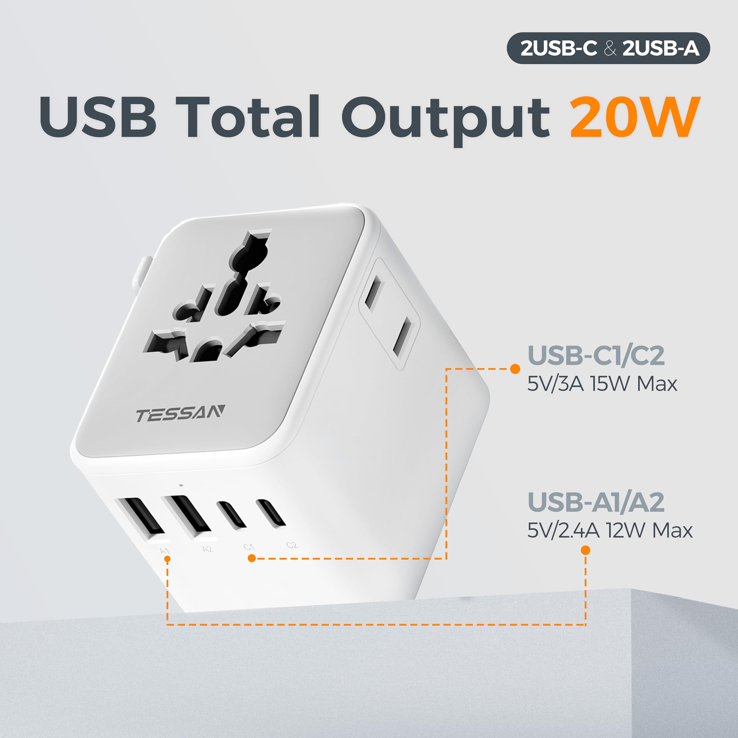Universal Adapter with USB C: Power adapter for international travel features USB C1 C2 (15W max per port), charge phone, tablet, and other devices, reducing waiting time; The USB A1 A2 deliver 12W max per port and meets your various charging needs