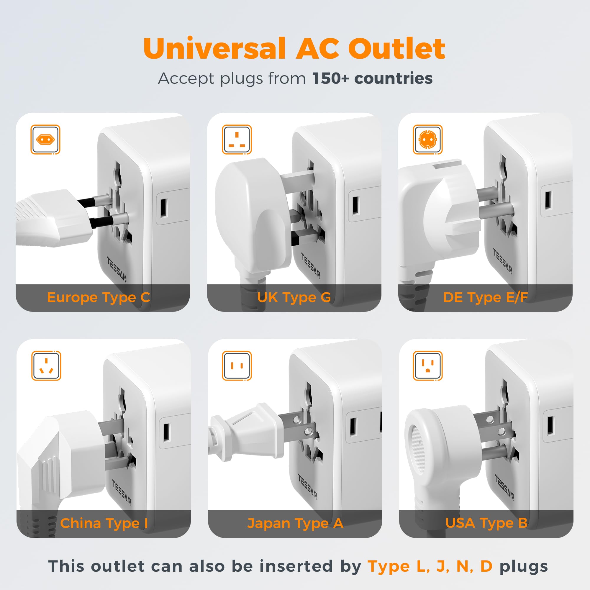International Power Adapter: This TESSAN universal travel adapter covers over 150 countries; Type C for lots of Europe Italy, Spain, France, Germany; Type G for UK, Ireland, Scotland, British; Type I for Argentina, Australia, Fiji, China; Type A for Japan, USA, Mexico