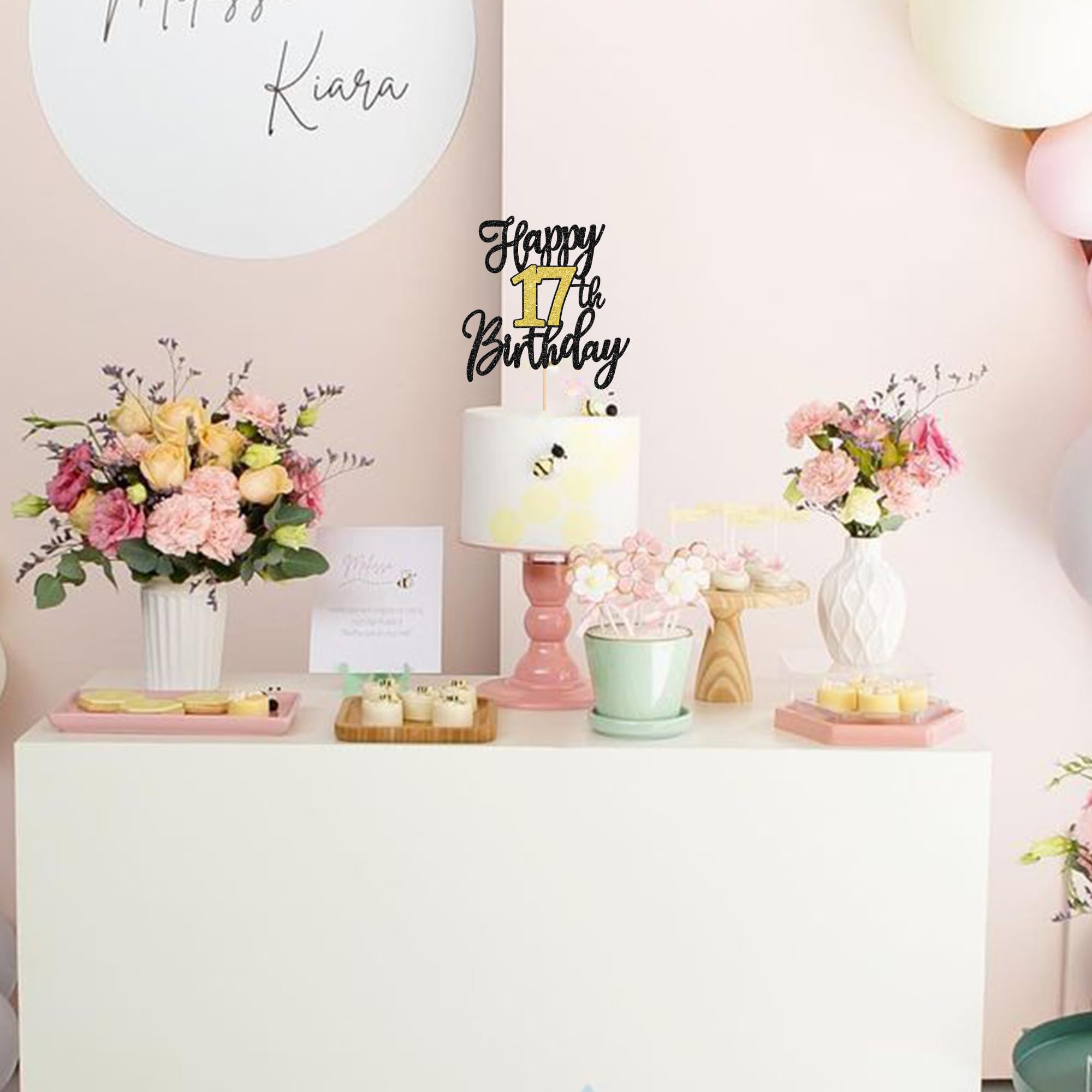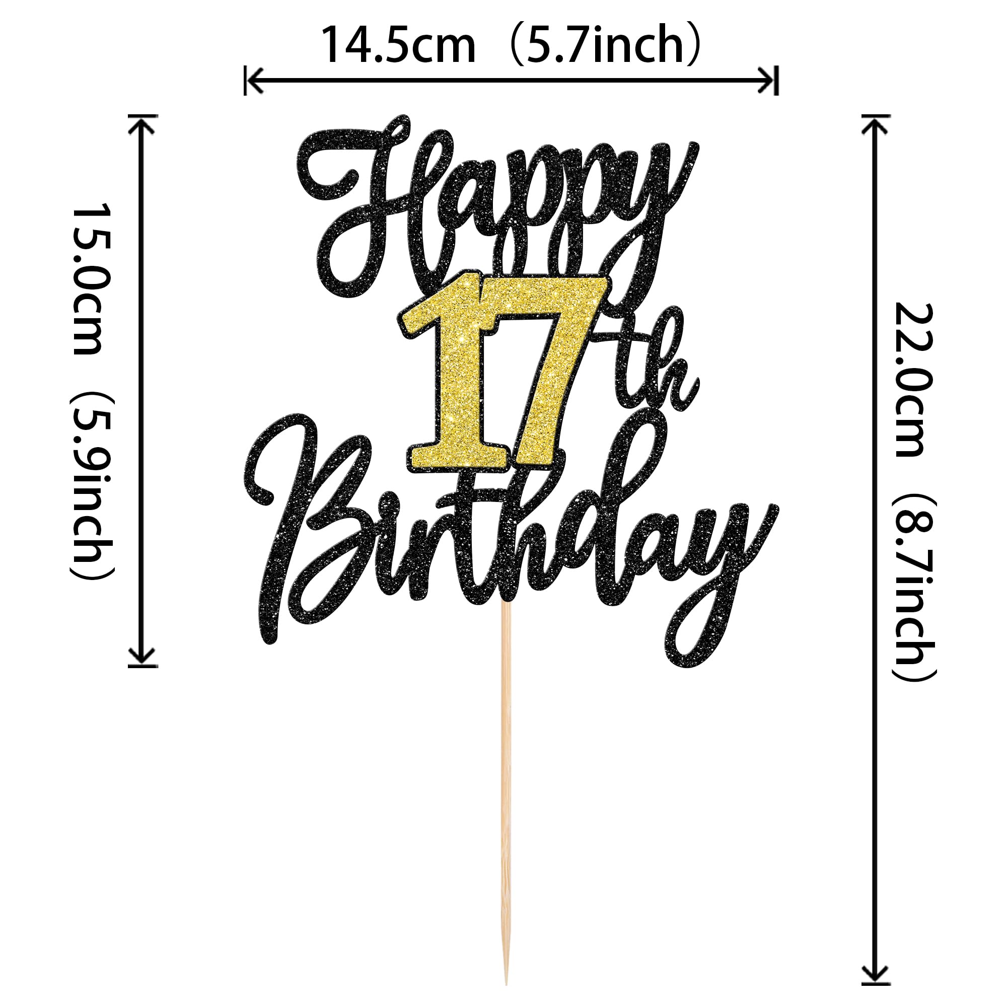 Happy 17th Birthday Cake Topper for Cheers to 17 Years 17 Fabulous Happy 17th Birthday Anniversary Theme Party Cake Decorations Supplies. perfect for happy 17th birthday theme party, cheers to 17 years theme party, 17 fabulous theme party, happy 17th birthday anniversary theme party cake decorations supplies. Pack of 1 pcs. The size is W 5.7 inch * H 8.7 inch / W 14.5 cm * H 22 cm ( with stick ) Made of high quality paper card stock and food grade sticks,thick and sturdy. This cake topper is one side glitter, another side is white, and this is intended for decoration only, please do not put them in oven or microwave. If the item you received has any defects, please contact us for refund.we will deal with it within 24 hours.