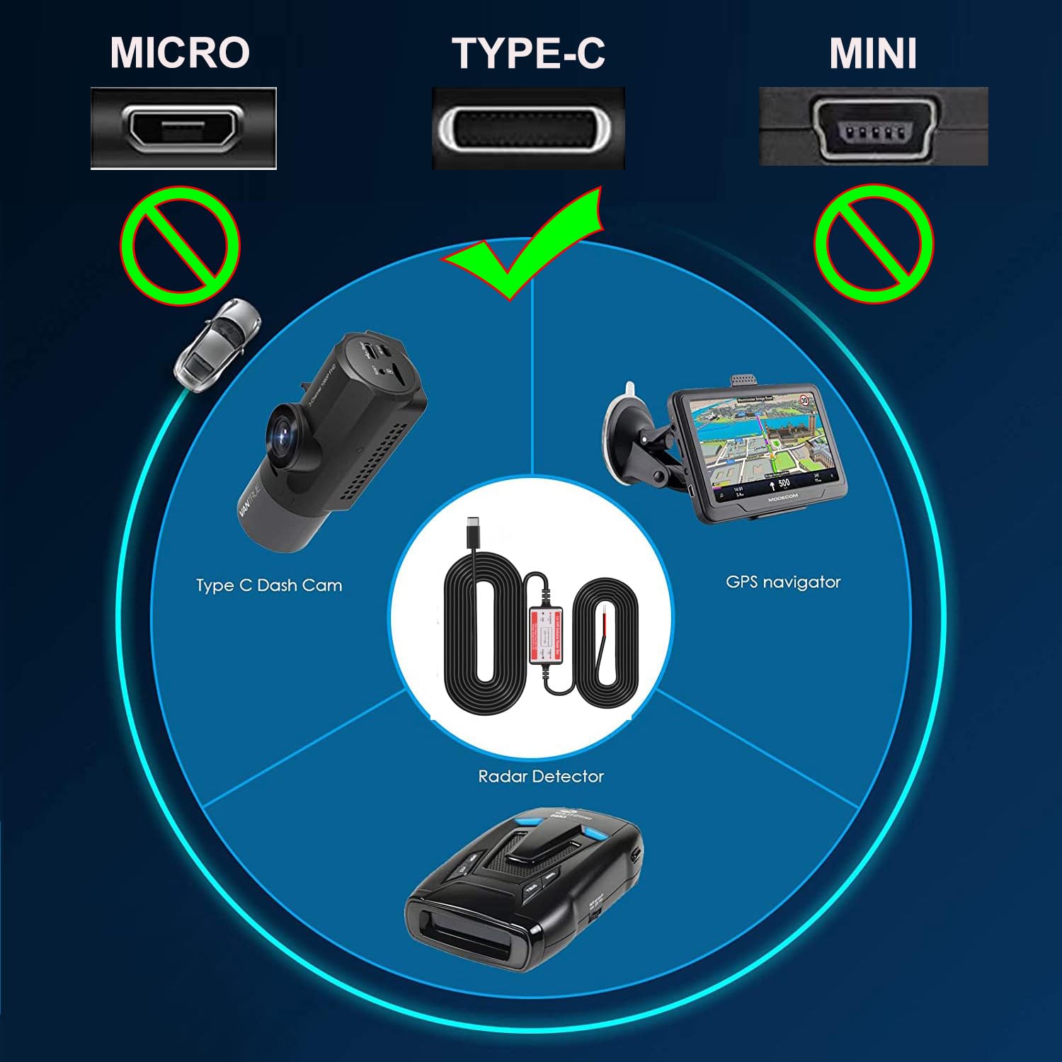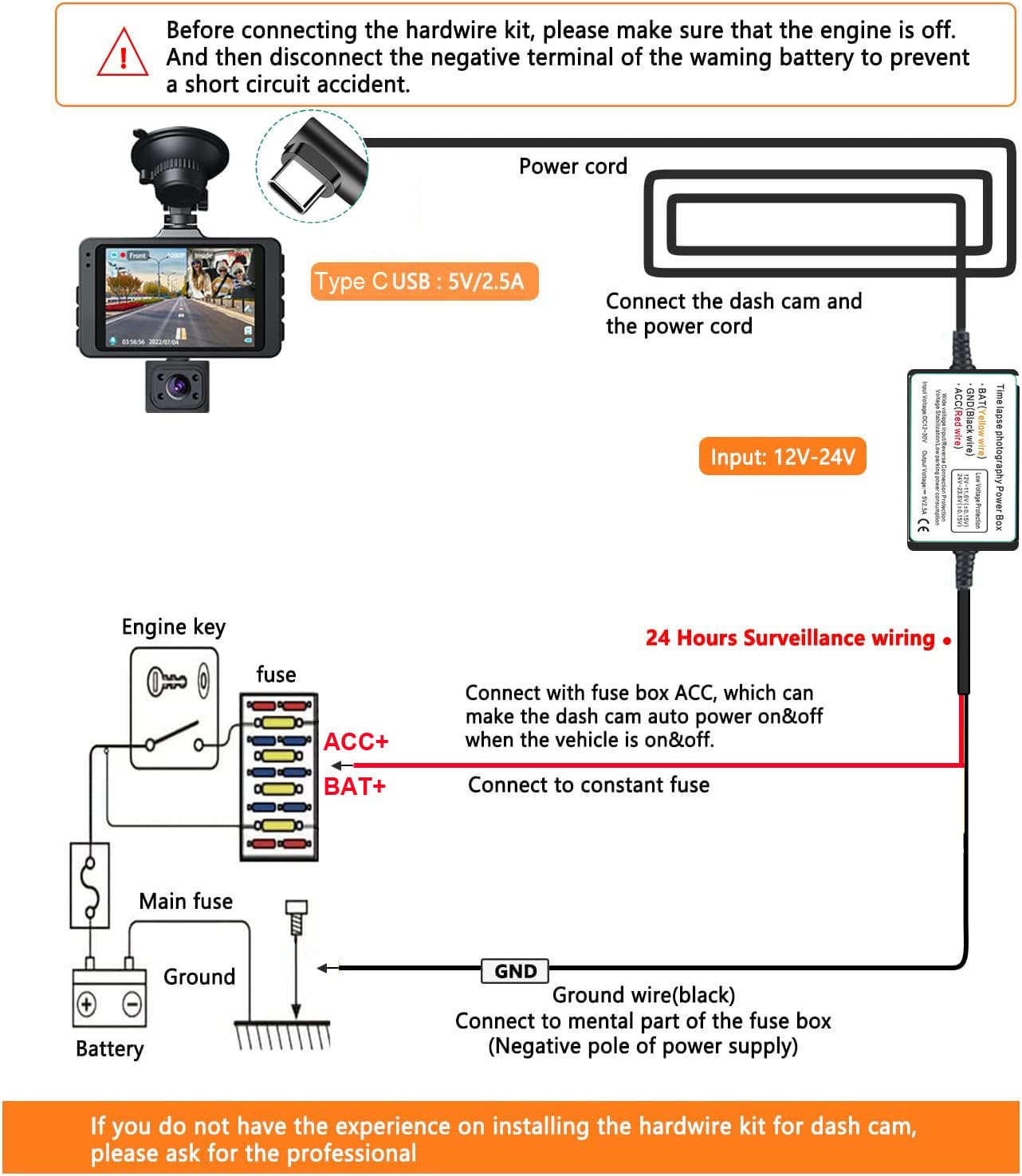【Wide Range】 3.2m long hardwire kit for dashcams or other devices powered by Type C USB port, 5V/2.5A stable output, voltage input supports 12V-24V, compatible with almost all brands of dash cams on the market.