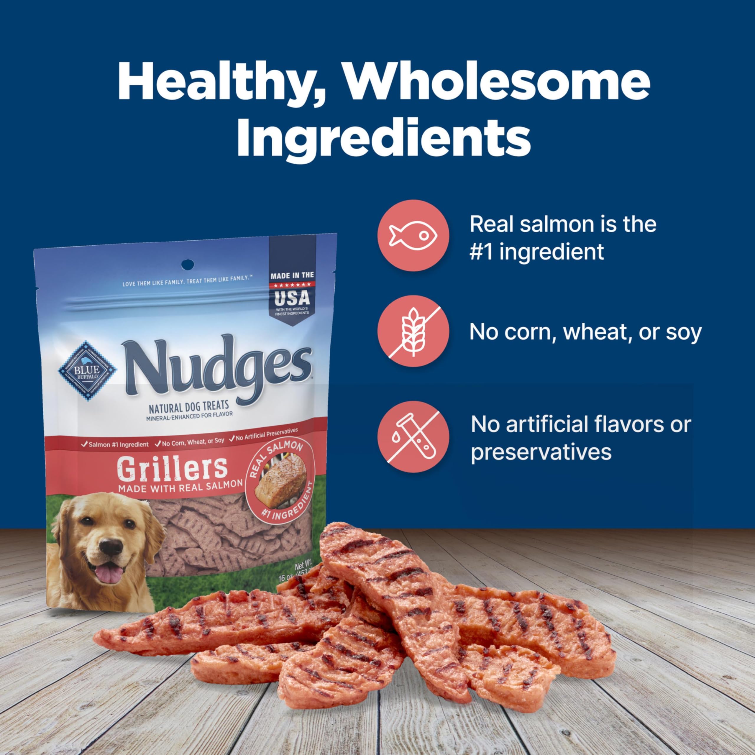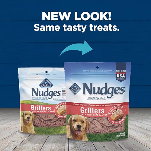 INCLUDED IN PACKAGE: contains one (1) 16-oz. bag of Blue Buffalo Nudges Grillers Natural Dog Treats; Salmon Recipe
