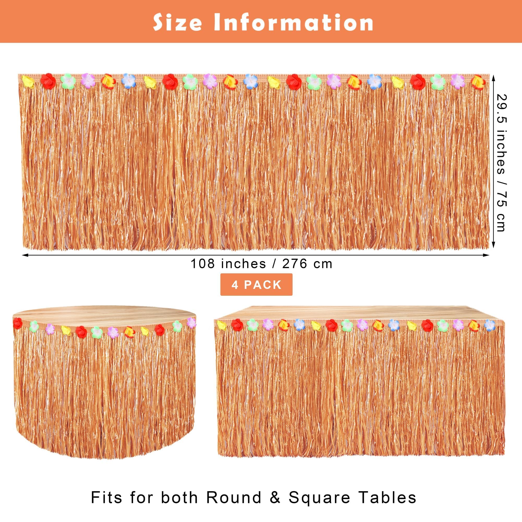 Proper size: the size of each grass table skirt for luau party is 108 x 29.5 inches / 276 x 75 cm, which can be stuck around tables of different shapes, adding more festive touch to your Hawaiian themed events