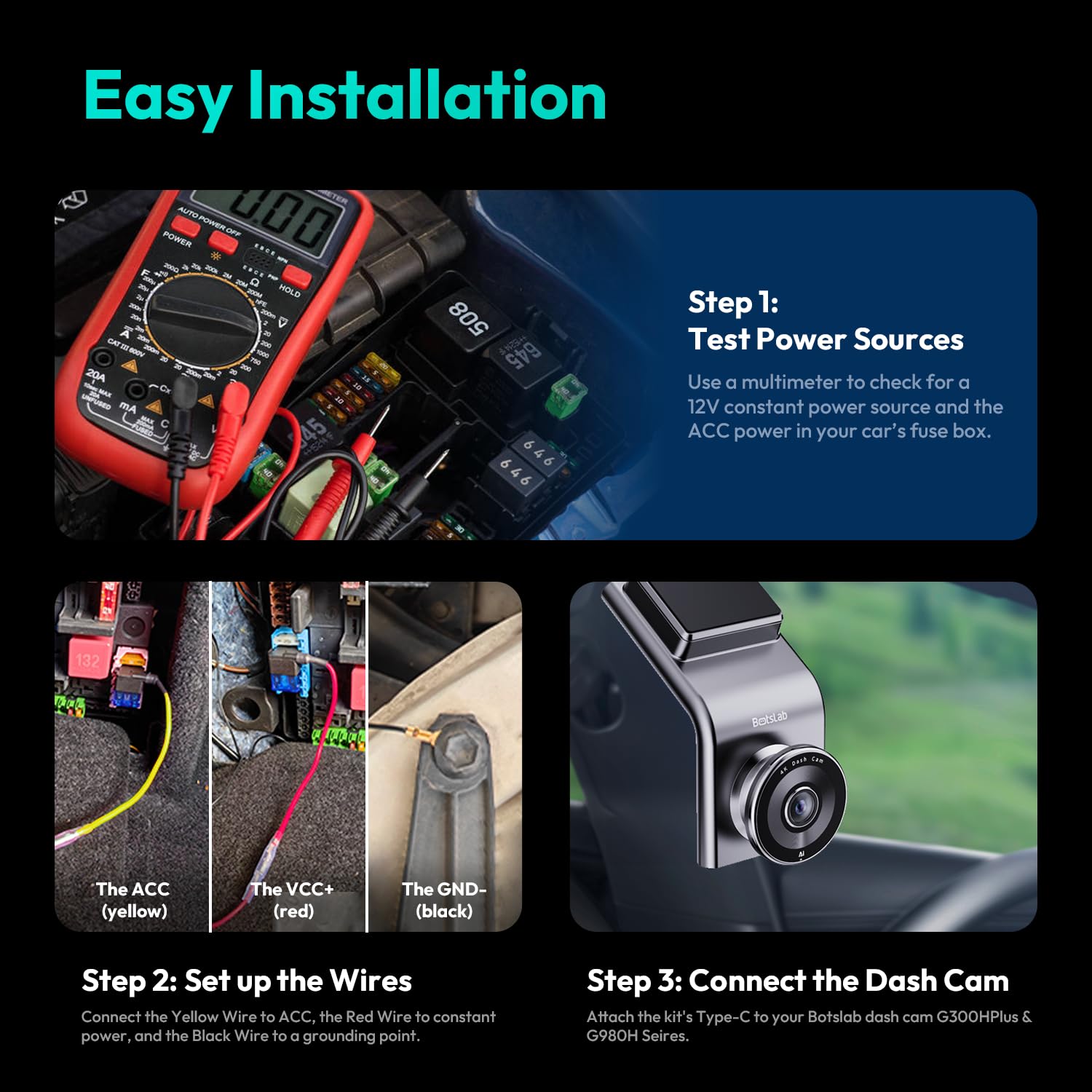 【Easy Installation】Simple three-step process: test power sources, set up the wires, and connect the dash cam. Detailed instructions are provided for a hassle-free setup.