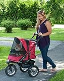 Whether you are an avid jogger or you simply want an extra smooth ride for your pet, the Pet Gear, Inc. Jogger NO-ZIP Pet stroller is the perfect fit. No zippers means no hassle when trying to open and close the stroller. Our new NO-ZIP technology means that you can easily gain access to your pet without fumbling with difficult zippers! The Jogger NO-ZIP Pet Stroller also features an elevated paw rest. Your pet can easily look out of the stroller by using the front bar for support. This stroller navigates over rough terrain with ease, whether jogging or strolling, thanks to the front locking wheel and gel-filled tires. Speaking of strolling, the new panoramic view window allows your pet to remain safe inside of the stroller without missing any sights along the way! Features large storage basket, parent tray for all of your extras, interior safety tether and 12" gel-filled tires. Interior dimensions: 30"L x 13"W x 22"H. Suitable for pets up to 75 pounds. Available in three colors: Forest Green (PG8400NZFG), Midnight River (PG8400NZMR) and Rugged Red (PG8400NZRR). Gel-filled tires ride like gel-filled won't go flat!