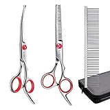 Two Grooming Scissors Kit - Professional dog scissors for grooming with 1 x curved scissors, 1 x thinning shears, 1 x grooming comb, can trim body fur with smooth blades.