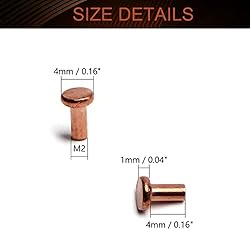 MroMax Round Flat Head Rivet Specification: Product Name: Round Flat Head Rivet Brand: MroMax Length: 4mm/0.16"Outer Diameter: 2mm/0.08"Color: Brass Tone Material: Metal Copper Description: 1. Due to its decorative appeal, copper is an ideal material for the manufacture of functional objects, and its electrical conductivity makes it very suitable for electrical applications. 2. We have improved the strength of copper products through the cold forming process, making it an ideal fastener to meet your requirements. 3. Copper rivets and fasteners are often used in manufacturing applications due to their strength, corrosion resistance and performance after cold heading. Note: 1. Please check the size before you place an order. Please allow 1-2mm difference due to manual measurement,thank you. 2. Due to various factors such as the brightness of the display and the brightness of the light, the actual color of the product may be slightly different from the picture on the website. 3. Please keep your child away from it to avoid accidental injury. Package content: 200PCS x Round Flat Head Rivet
