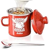 [Stylish Design] - The bacon grease keeper holds 15 OZ of grease, which is functional for both straining, storing, and transferring. The enamel container helps the grease temperature to drop quickly and evenly. The stylish cup wall pattern makes up its retro farmhouse style.