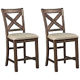 COUNTER HEIGHT BAR STOOLS: Taking a clever approach to practical design, these barstools impress with the X-back styling and cozy cushioning. The antiqued gray wash finish has staying power that wows
