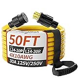 High Quality: 100 foot 4 prong generator extension cord 30amp, STW 125/250V, 3750W/7500W, NEMA L14-30P to L14-30R. Ideal for connecting portable generator to manual transfer switch, house and outdoor RV use. Made of pure copper, avoid overheating due to long-time use, more durable and safe. Weatherproof & Durable: Heavy Duty Outdoor generator cord 30 amp 4 prong exhibits excellent weather resistance IP65 waterproof, making it suitable for use in various weather conditions, including sunlight, rain, and low temperatures (-40°C). It is constructed with high-quality materials and is heat-resistant, flame-retardant, corrosion-resistant, wear-resistant ensuring safer and more reliable. Twist Locking Design: The twist lock plug prevents cord falling off due to external force in various severe weather conditions. Easy grip and strain relief plug and socket design ensures the plug can bent at any angle without breaking. Flexible & Easy to Storage: L14-30 generator cord 100 ft jacket is made with solid and flexible material, allowing for easy bending and storage, adapting to different layouts and environments. Additionally, Equipped with an adjustable cord organizer that enables neat coiling of the cord and hanging, making storage and transportation hassle-free and preventing tangling and confusion. ETL & Service: 3 years promise 4 prong generator cord 30 amp 100ft. Your satisfaction is our greatest pursuit, if you may encounter problems during use, you can always contact us, and we will solve it in 24 hours.