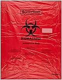 2mil red 20- to 30-gallon biohazard waste disposal bag with warning label and sterilization indicator patch for disposing of and sterilizing biohazard waste