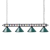 No game room is complete without proper lighting to illuminate the billiards table. This 70-inch green matte pool table light is sure to add the finishing touches to your décor. Featuring four metal shades held together by a Black pole with attractive colorful billiards balls, this fixture gives the look of understated elegance. When this hard-wired fixture is connected to an electrical source, unsightly electrical cords are eliminated and you will be able to illuminate your table with the flick of a switch. Features Easy to install on your ceiling to illuminate your bar, living space Adjustable 35.4 in. hanging chain to accommodate your home style For energy savings, use four 60-Watt max E26 bulbs (sold separately) 4-light minimize annoying shadows on the pool table surface High-quality metal constructed lighting fixture, built to last and offers a clean classic look Perfect for your game room, dining room, kitchen island, pool table, bar, restaurant, warehouse etc Dimensions & Weight Size: L70.86 inch× W14.17 inch × H13.62 inch, Ceiling Plate: 4.72 inch(12cm) * 1.38 inch(3.5cm) Chain: 35.4 inch (90cm), 31.50 inch(80cm) Chain/Cord Adjustable Lampshade: 14.01 inch(35.6cm) * 7.3 inch(18.54cm) Net Weight: 24.25lb(11kg) Bulb Information Bulb Type: LED/Incandescent/Fluorescent Bulb Base: E26 Bulb Included Or Not: Not Included Wattage Per Bulb Max: 60W
