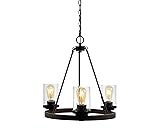 Perfectly sized for an entry, over kitchen table, or in a cottage dining room, this wrought-iron style chandelier features LED candles with vintage glass shades. An oil-rubbed bronze finish completes the Old World look. Use this versatile pendant chandelier in your Tuscan or Spanish style home, or to add character to a rustic, industrial space.