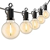 2 PACK Updated Version Energy Efficient 30FT Outdoor String Lights: With hooks updated version design, you do not need to buy additional hooks, installation is easier and more efficient. 30 feet long lights for backyard come with 30 clear G40 shatterproof bulbs. The distance between lights is only 12 in for more brightness. Light bulbs have candelabra (E12) socket base, 1W per bulb. End to end connect up to 24 strands.