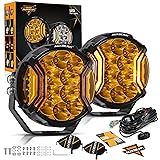 【ULTRA-CLEAR VISION】This 4-inch pod light with dual side shooters offers a bright 6900K white color temperature for extensive illumination. The 3000K amber DRL (Daytime Running Light) delivers a soft, low-glare light that reduces eye strain and enhances comfort. Ideal for fog, rain, or nighttime driving, this lighting solution ensures optimal visibility for both you and others on the road.