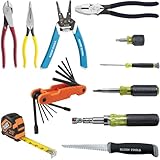 Product Description The Klein Tools 12-Piece Electrician's Tool Set includes a variety of valuable tools for any professional or do-it-yourself electrician. The set includes four sets of pliers and four popular Cushion-Grip screwdriver sizes. It also comes with a tape measure, wire stripper, and convenient leather pouch and adjustable web belt to hold all of the tools. For more than 160 years, Klein Tools has manufactured premium-quality, professional-grade hand tools that deliver the performance, durability and precision needed to get the job done right. Our family of engineers, workers and craftsman continue to put six generations of expertise into every tool we create by using only the highest quality materials, superior workmanship, and keeping manufacturing as close to home as we can. Klein isn't just the name of our company, it's also our family name. And since we're an American company that's family-owned and family-run, you know you can count on us to be here tomorrow. Klein Tools doesn't just make great products, we make great products that stand up to the demands of the professionals who use them every day ... Since 1857. From the Manufacturer Since 1857, the company operated by Mathias Klein and his descendants to the fifth generation, has grown and developed along with the telecommunications and electrical industries where Klein pliers first found major usages. Today, Klein Tools, Inc. represents much more than Klein pliers. The company's product line has broadened to include virtually every major type of hand tool used in construction, electronics, mining, and general industry in addition to the electrical and telecommunications fields. Some projects are more complex than others and require a variety of tools to be used. For this reason, Klein has tool kits to assist professionals with these demanding projects. The Klein 12 piece tool set is a perfect kit for professionals or aprentices. It comes with two Phillips-tip screwdrivers, two cabinet-tip screwdrivers, one wire stripper/cutter, one diagonal-cutting pliers, one long-nose pliers, one side-cutting pliers, one pump pliers, one power-return measuring tape, one web belt, one tool pouch.