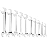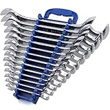 Get your job done with Efficere Tools 15-Piece Premium Angle-Head Wrench Set in Metric sizes. This is the perfect wrench sets you need for home projects, garage works, plumbing, construction, machinery, equipment, hydraulic, aircraft and aviation, and a lot more, no matter you are a homeowner, DIYer, mechanics, contractor, a shop owner, or just look for an ideal tool gift for men. It is also a necessity for auto repairs and truck services to handle with brake line, diesel engine, strut, ignition etc. All the wrenches are constructed from high strength chrome vanadium steel with corrosion preventative mirror chrome finish to ensure durability and exceed ASME/ANSI B107.6 quality standards. They feature with the specially engineered 15 degree and 60 degree offset double open-ends, which give you more access to tighten or loosen bolt, nut, fitting or hose in tight spot. All the jaws are precisely machined with extra thickness to provide greatest torque and leverage that you need to withstand the forces for heavy jobs. Including the most common non-skip standard metric sizes from small 10 mm to large size up to 24 mm, this angled-head combination wrench kit is stored and organized in a durable rack with a space-saving foldable handle grip, which is more convenient than a canvas roll up pouch for carrying, storing in tool box and hanging on pegboard. Wrench sizes include: 10mm, 11mm, 12mm, 13mm, 14mm, 15mm, 16mm, 17mm, 18mm, 19mm, 20mm, 21mm, 22mm, 23mm, 24mm.